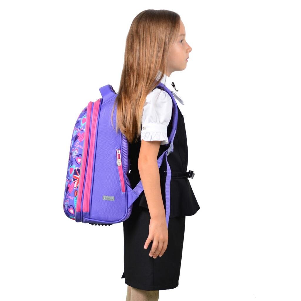 Вага: 980+-10% г Розмір М: 29х38х15 см Кількість відділів: 2 основних відділення. Всередині є органайзер і відділення для лептопа. Зовні на бічній стороні рюкзака (ближче до спинки) розташована прорізна кишеня на блискавці. Особливості: виготовлений з поліестеру з водовідштовхувальним просоченням, що забезпечує збереження речей вашої дитини в будь-яку негоду, а щільний каркас гарантує повну цілісність вмісту (на лицьовій частині також є вставка з матеріалу EVA). Ортопедична спинка зменшує напругу м'язів спини, плечей і шиї, і забезпечує правильну поставу. Вона обшита "дихаючим" матеріалом Air Mesh. Також у рюкзака комфортні м'які лямки регульованої довжини (+нагрудний ремінь), щільне каркасне дно, зручна прогумована ручка для носіння в руці і м'яка ручка. В цілях безпеки передбачені світловідбиваючі елементи з різних боків рюкзака.