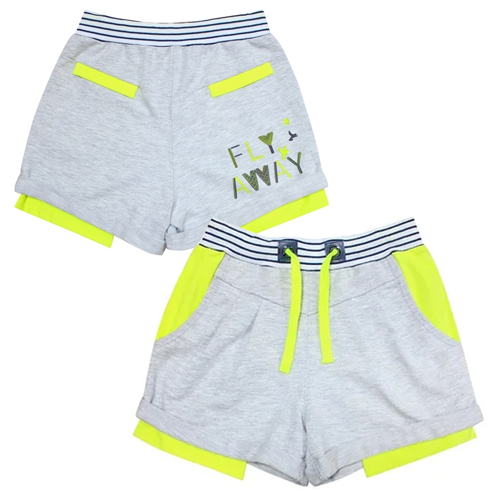 Трикотажні шорти вільного крою - незамінна річ для занять спортом, активного відпочинку. Для дівчат 2-6 років. Пошиті з бавовняної тканини з додаванням еластану. Основний колір - сірий меланж. Є яскраві неоново-салатові вставки, кишені, еластичний пояс зі шнурком.