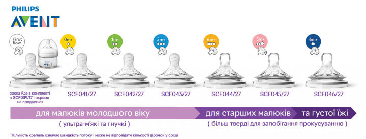 Соски мають маркування: цифри і зображенням крапель, що визначає швидкість потоку!
