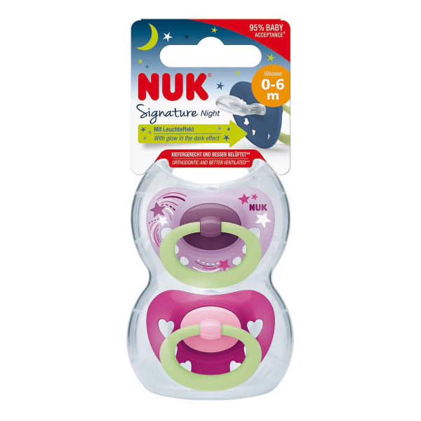 Набір з 2-х пустушок для дітей від народження до 6 місяців. Виготовлений з пластику та силікону. Завдяки ортодонтичній формі соски, пустушка зручна для малюка. При смоктанні вона нагадує груди матері. Загубник має вентиляційні отвори, що попереджають накопичення слини навколо рота. Світиться у темряві.