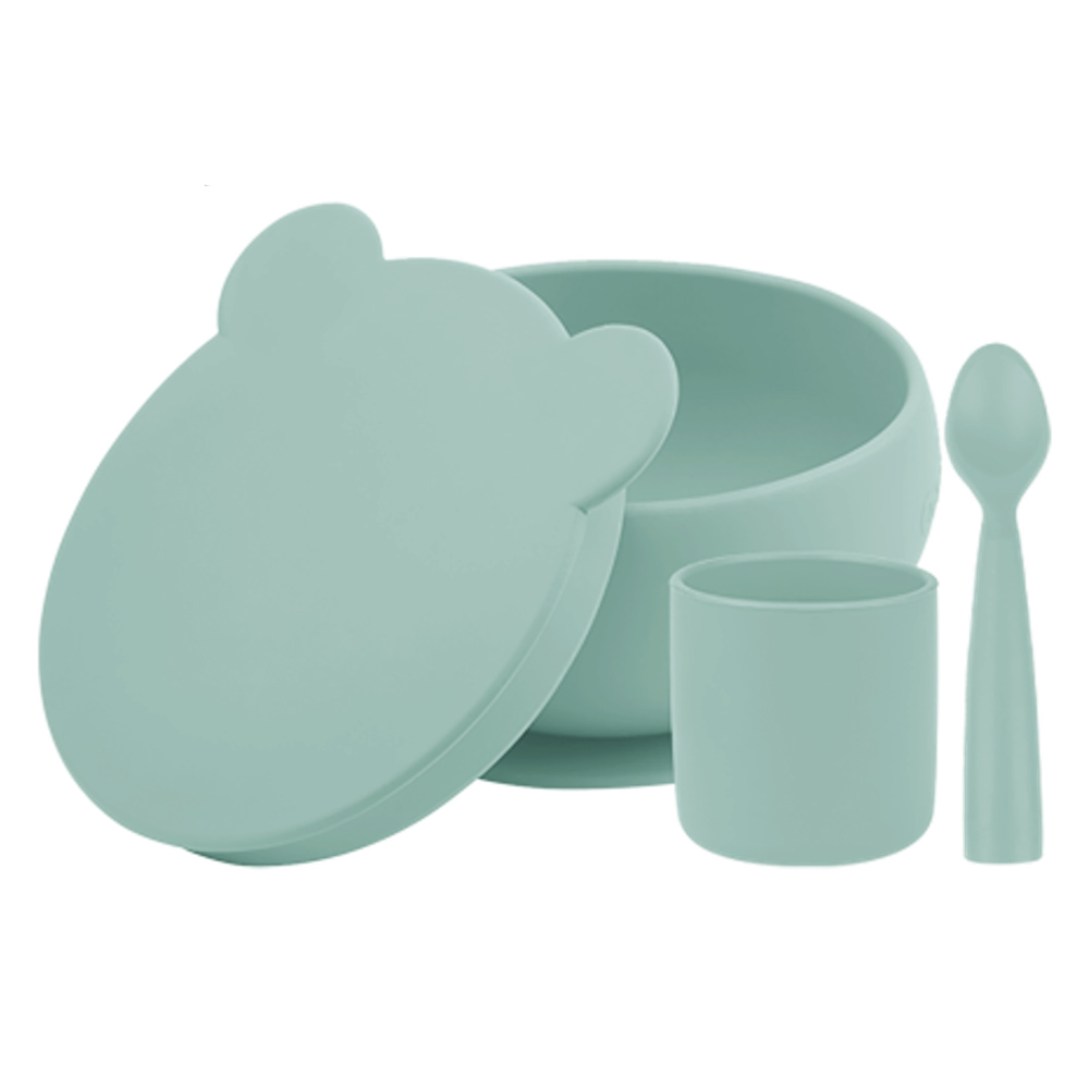 У комплекті ложка, чашка та тарілка з кришкою.