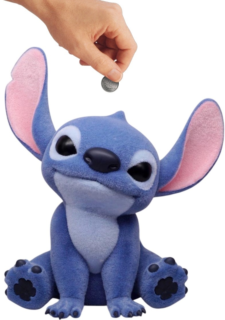 На спинці Стіча є отвір, крізь який можна закидувати гроші, монетки, папірці з афірмаціями тощо. Щоб дістати свої збереження, витягніть пластикову затичку на нижній частині скарбнички. А ще у нього є суперфішка - він флокований та надзвичайно приємний на дотик.