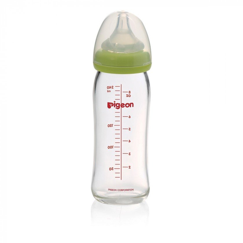 • Скляна пляшечка для годування Pigeon Перистальтик Плюс об'ємом 240 мл призначена для малюків від 3 місяців. У пляшечки широка горловина, кільце, що не допускає протікань. У комплекті силіконова соска з хрестоподібним отвором розміру М. Соска має вентиляційний отвір, що дозволяє рідині плавно надходити в ротик, а дитині не захлинатися під час їжі. Конструкція і форма соски виконані таким чином, щоб підтримати грудне вигодовування. П