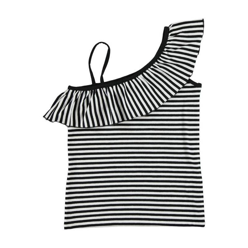 Стильна смугаста майка iDO в еластичному бавовняному трикотажі з шлеєю на одному плечі, додатково прикрашена воланом. Дуже красива і не залишиться поза Вашою увагою.