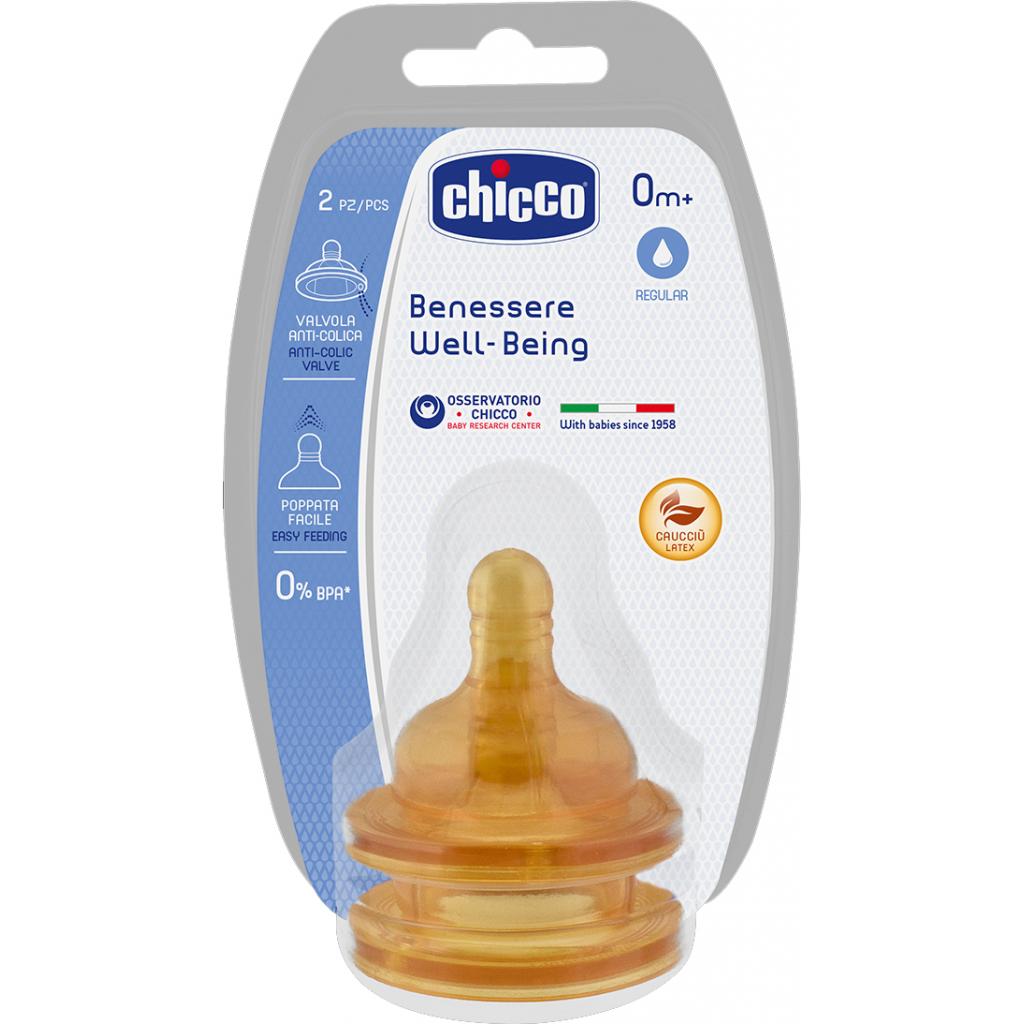 Особливості Chicco Well-Being латексна нормальний потік 0 міс + 2 шт: доведена ефективність антиколікової системи: спеціальний клапан перешкоджає заковтування повітря, що зменшує ймовірність кольок і відрижки після годування. Рельєфні кільця біля наконечника соски забезпечують малюкові природні відчуття під час годування. Широке і заокруглене підставу комфортно прилягає до дитячим губах і полегшує процес смоктання. М'яка і еластична соска забезпечує вигодовування, найбільш наближене до грудного, що є ідеальним рішенням під час змішаного або повністю штучного вигодовування.