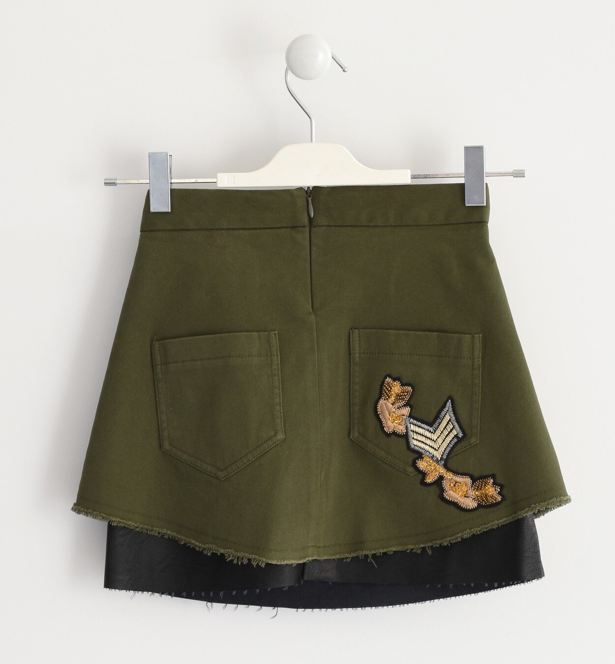 Коротка спідниця кольору "хакі", з імітацією двошаровості у сміливому стилі мілітарі. Має А-силует, вставку з екошкіри по низу, застібку-обманку на ґудзиках спереду. Застібається на блискавку ззаду. Має 2 задні накладні кишені. Прикрашена вишитими квітами та стразами. Склад: 98% бавовна, 2% еластан.