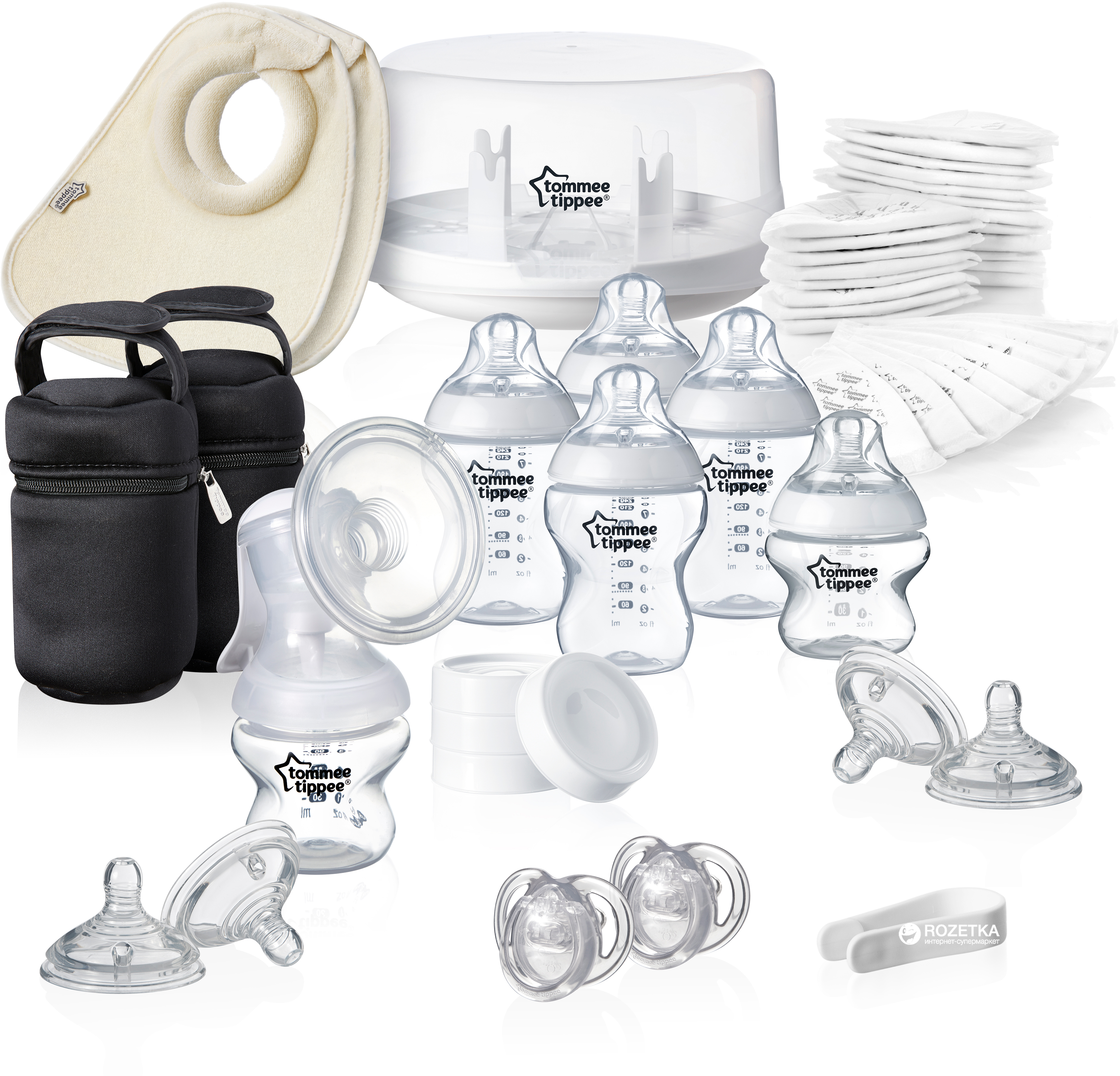 До стартового набору для немовлят Tommee Tippee входить: Паровий стерилізатор — 1 шт. Молоковідсмоктувач ручний — 1 шт. Пляшки (260 мл) — 4 шт. Пляшки (150 мл) — 2 шт. Термосумки для пляшечок — 2 шт. Нагрудники для годування — 2 шт. Вкладиші для бюстгальтера — 50 шт. Пустушки (0-6 міс.) — 2 шт. Соски для пляшечки "повільний потік" — 2 шт. Соски для пляшечки "швидкий потік" — 2 шт. Кришки для зберігання молока — 4 шт. Пінцет для сосок — 1 шт.