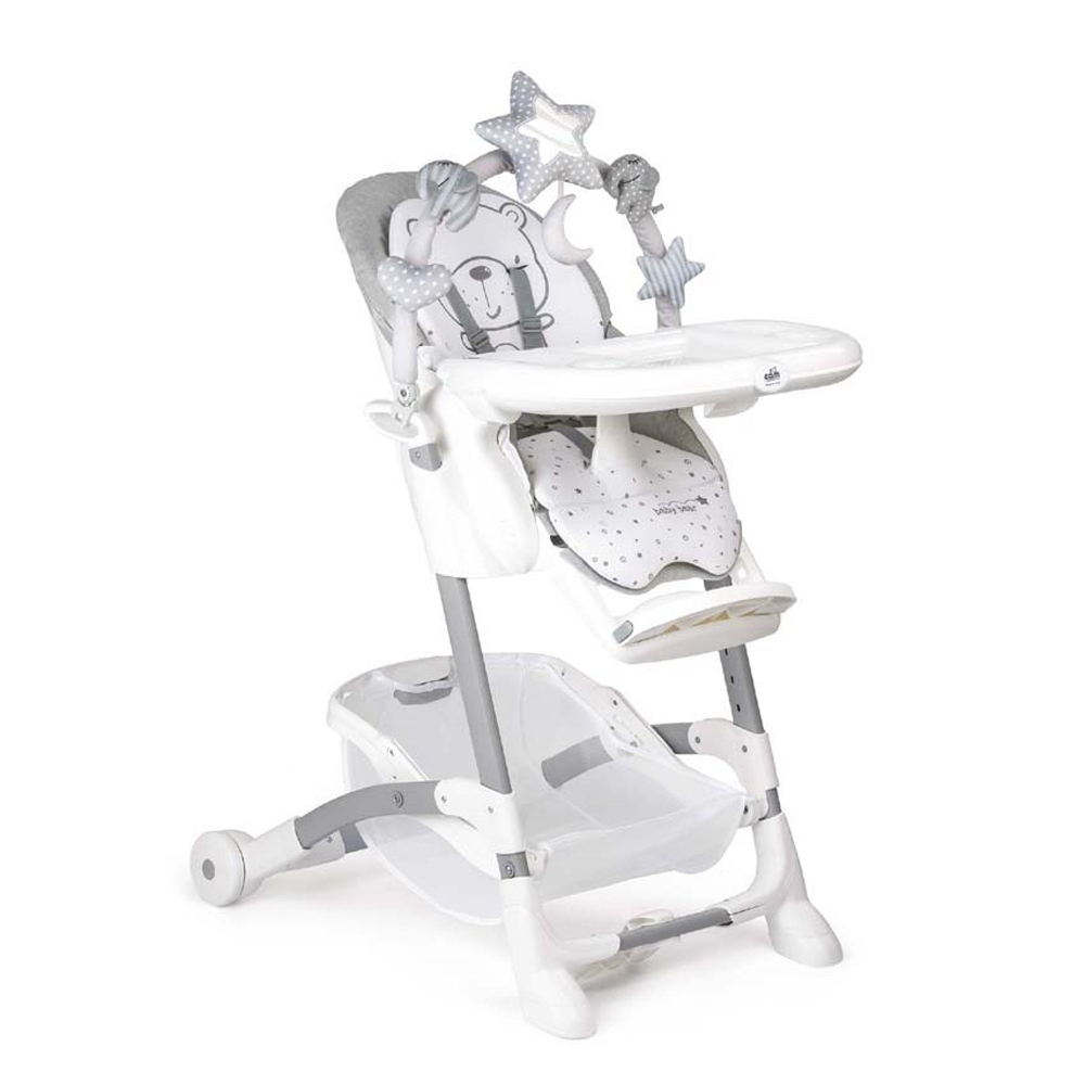 Особливості: 7 рівнів регулювання за висотою. Спинка регулюється в 4 положеннях. Підходить для дітей від народження. Підніжка регулюється за висотою (3 положення) і довжиною. Є 2 таці й відділення для зберігання. Оббивка зі штучної шкіри, є літній й зимовий боки оббивки. 5-точкові ремені безпеки. Ігрова підвіска обладнана знімними м'якими іграшками, дзеркальцем і брязкальцем. Є 2 позиції фіксації підлокітників. Задні коліщата. Просторий кошик. Дуже легко чистити губкою каркас і оббивку, знімні та мийні покриття при температурі 30 °C. Компактне зберігання. Простота у використанні.