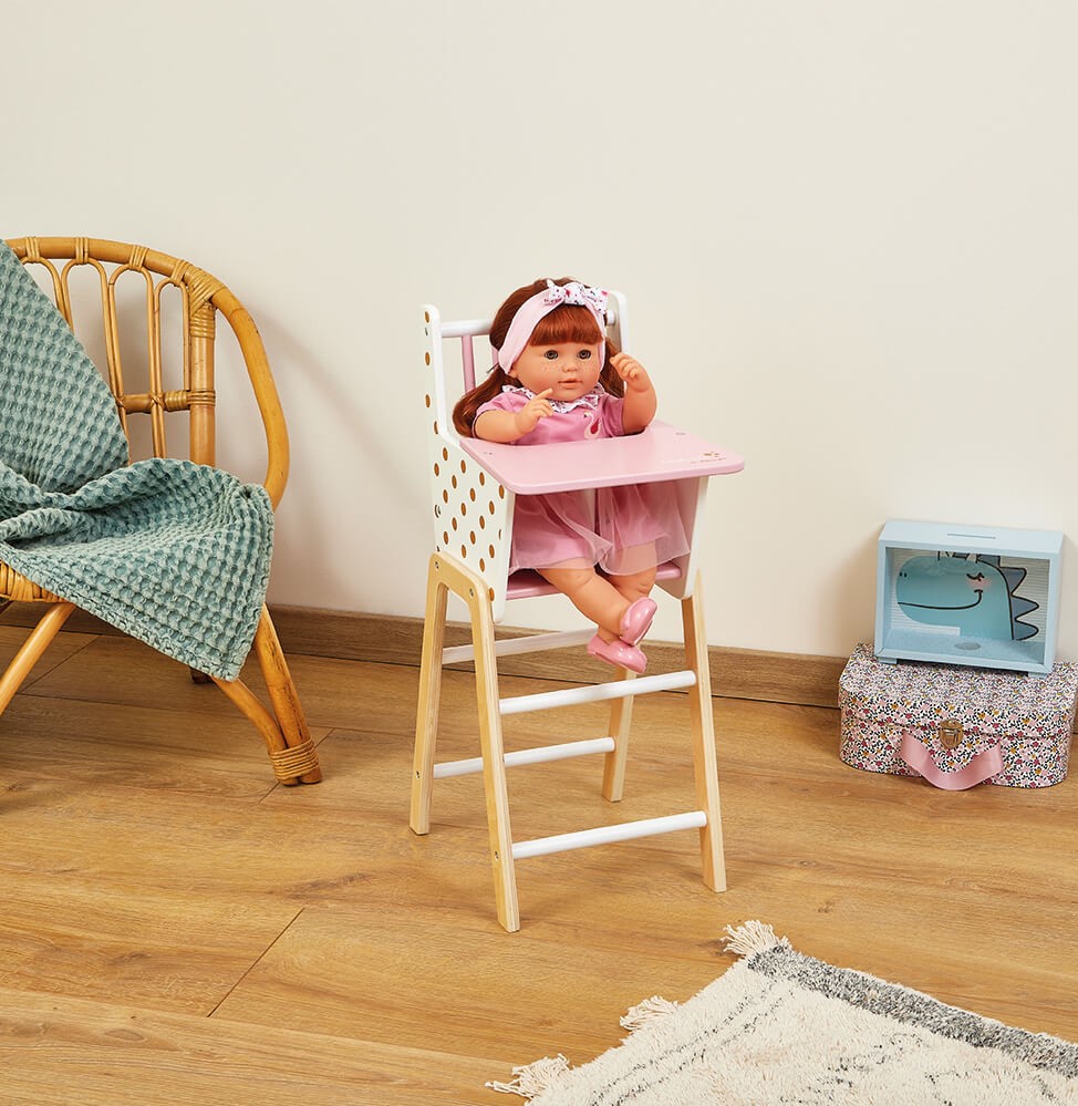 Дерев'яний стілець для ляльки французького бренду Janod серії Candy Chic в рожево-білих тонах здійснить мрії кожної дівчинки. Маленькі мами пізнають процес годування, граючи з ляльками відповідно до їх власної уяви. Симпатична подушка забезпечує зручну посадку для всіх ляльок. Рекомендований вік: 3+. Розмір: 22,5 х 27,5 х 52,5 см.