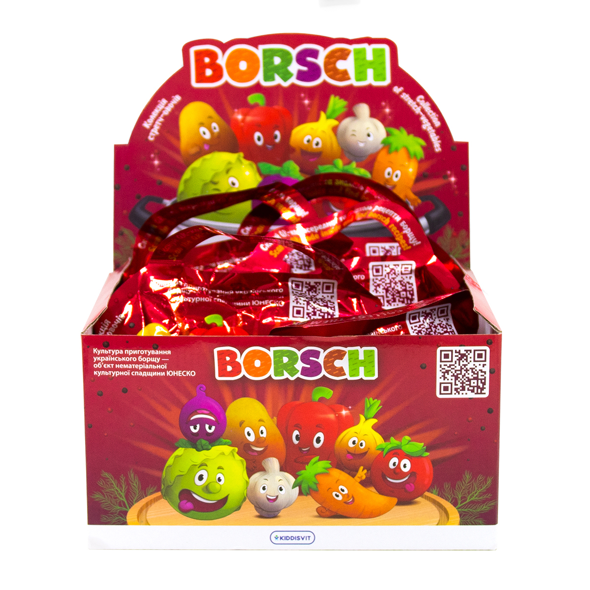 Купуючи дисплей, Ви отримуєте великі шанси зібрати всю колекцію овочів. Але завжди залишається ймовірність сюрпризу, адже можуть трапитись герої, що повторюються. Не засмучуйтеся. Продовжуйте збирати колекцію далі!