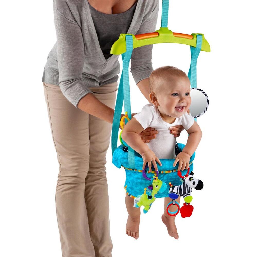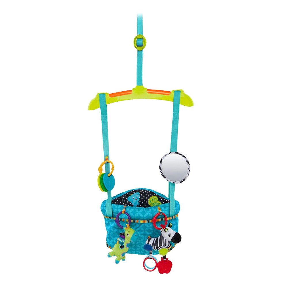 Стрибунці Bright Starts Bounce 'n Spring Deluxe підкачають м'язи ніг та спини дитини й забезпечать веселощі малюку. Виріб оснащений зручним тримачем, який надійно затискається у рамі дверей. Подушка сидіння знімається, її можна прати. Висота стрибунців регулюється відповідно до зросту дитини.