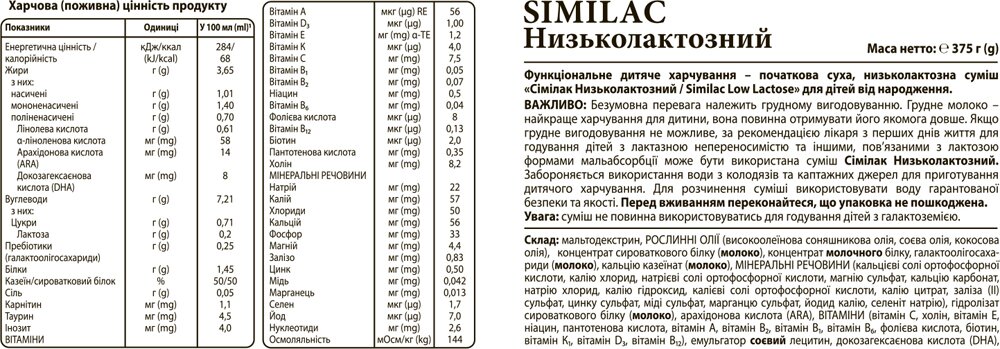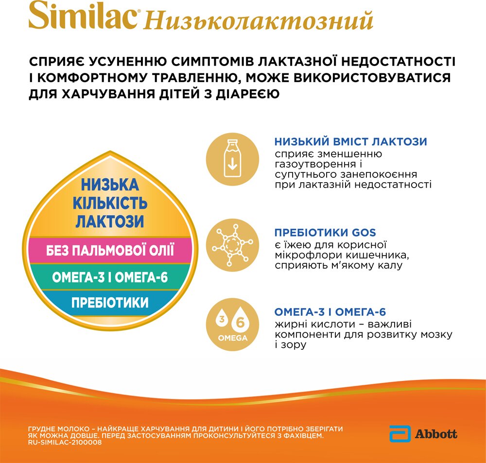 Містить: знижену кількість лактози - менше 0,2 г / 100 мл: експерти не рекомендують повністю виключати лактозу з раціону. Лактоза необхідна для розвитку головного мозку і зору, а також підтримання балансу кишкової мікрофлори. Пребиотики: для комфортного травлення та розвитку здорової мікрофлори кишечника. Нуклеотиди: для розвитку імунітету. Без пальмового масла: сприяє формуванню м'якого стільця, поліпшенню всмоктування кальцію, більш високої мінералізації кісткової тканини. Всі суміші Similac не містять пальмову олію, ГМО, барвники, консерванти і глютен.