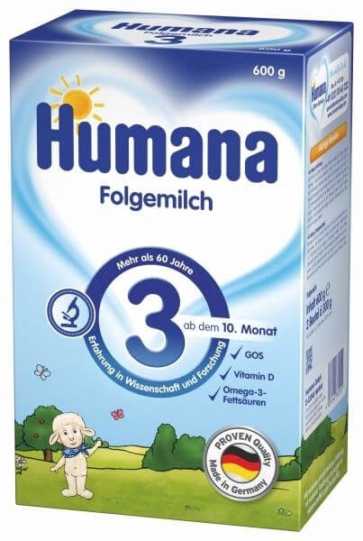 Молочну суміш Humana 3 можна використовувати у разі нестачі або браку грудного молока як безпечну альтернативу звичайного коров'ячого молока для дітей віком від 10 місяців. Містить усі необхідні білки, жири, вуглеводи, вітаміни, мінеральні речовини та мікроелементи для здорового росту малюка; натуральні пребіотики галактоолігосахариди (ГОС), які сприяють росту власних біфідо- та лактобактерій у кишківнику дитини, запобігаючи розвитку дисбіозу. Не містить глютену та кристалічного цукру.