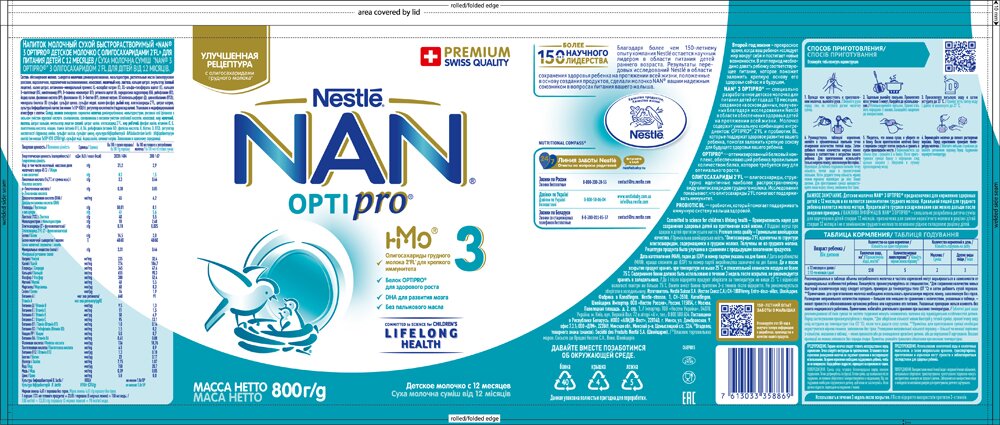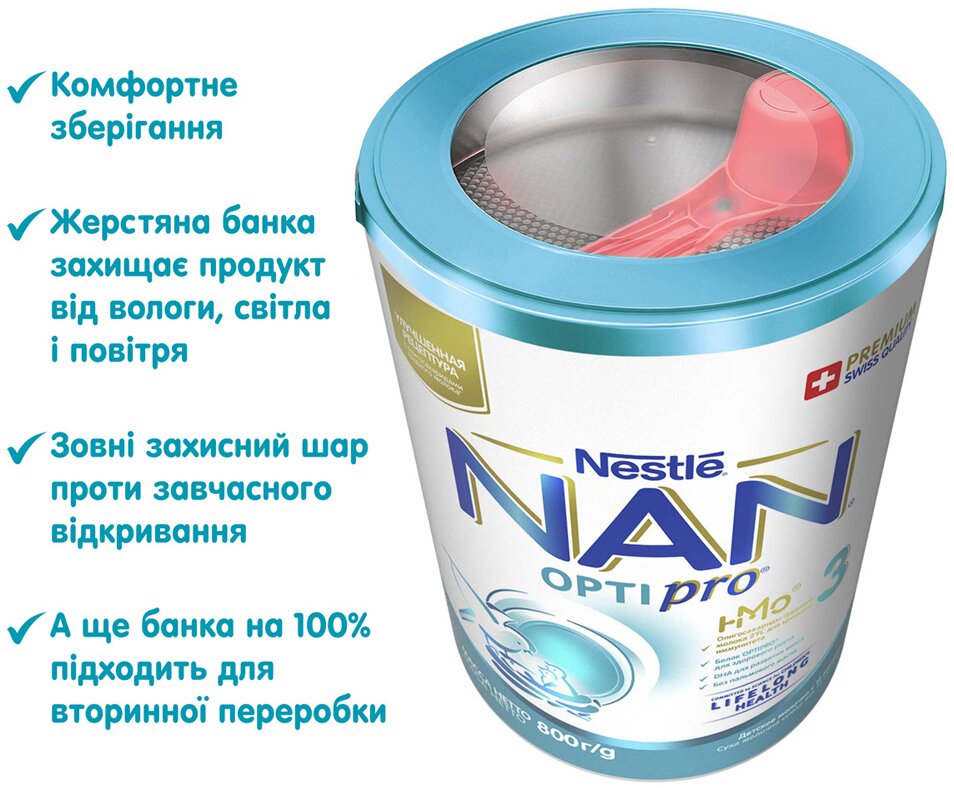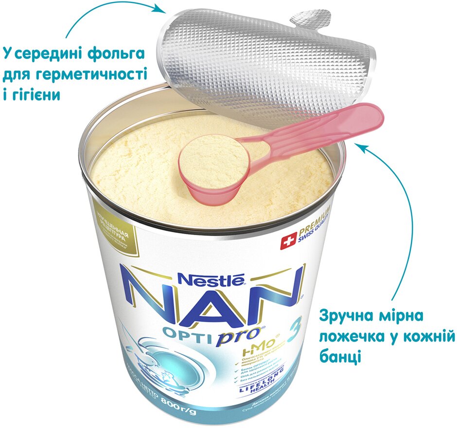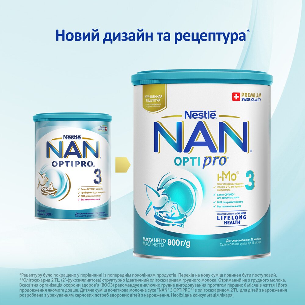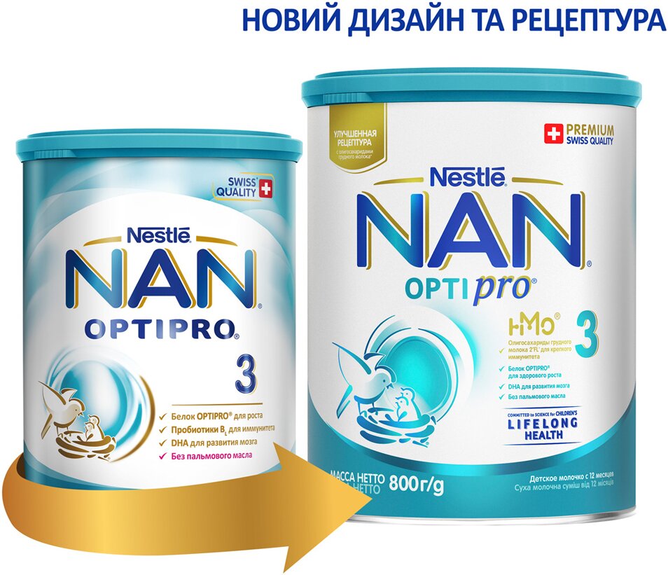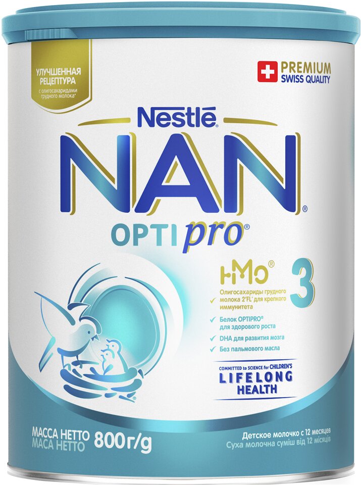 NAN 3 Optipro – спеціально розроблена суха дитяча молочна суміш для харчування дітей від року до 18 місяців, створена на основі даних, отриманих завдяки дослідженням Nestlé в області забезпечення здоров'я дітей протягом усього життя. Суміш містить особливу комбінацію інгредієнтів: Optipro, 2'FL і пробіотик BL, які підтримають здоровий розвиток вашої дитини, допомагаючи закласти міцну основу для майбутнього здоров'я вашої дитини.