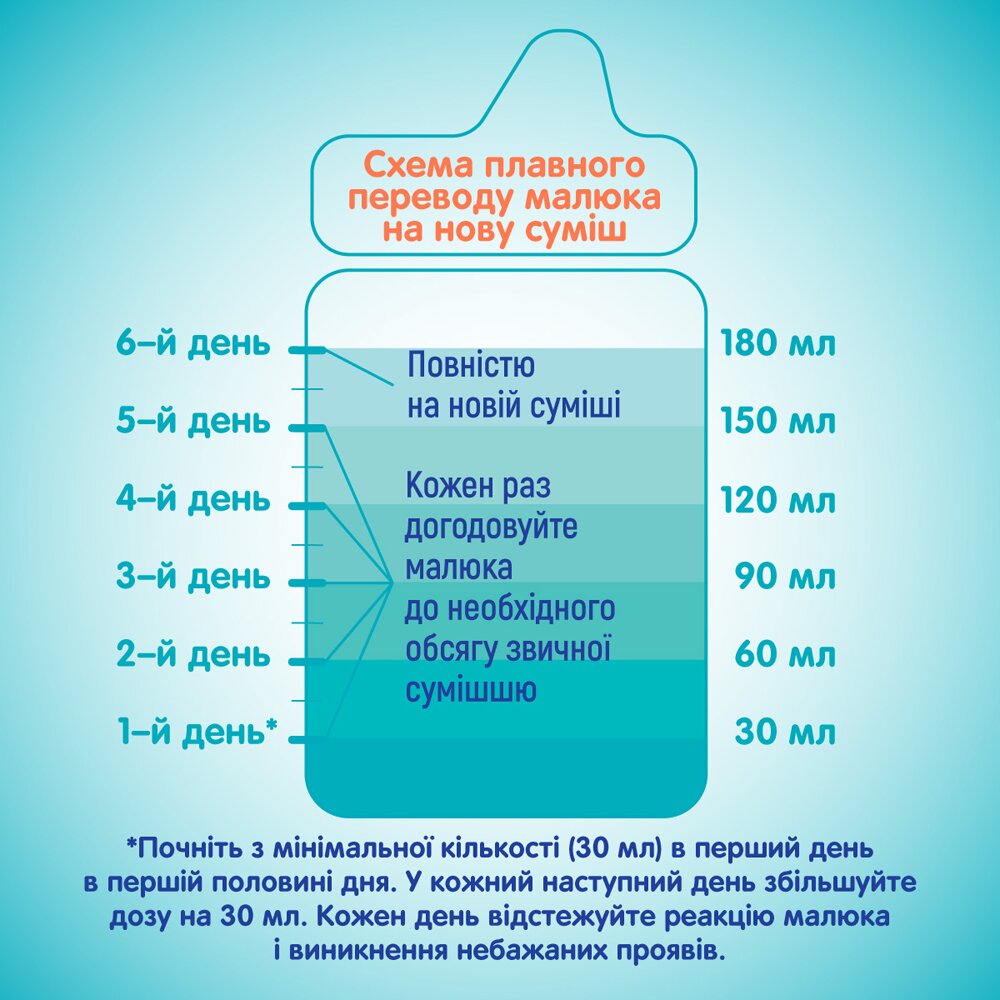 Інструкція з приготування: Вимийте руки перед тим, як готувати дитині молочну суміш. Ретельно вимийте пляшечку, соску та кришечку. Прокип’ятіть їх впродовж 5 хвилин. Залишайте накритими до використання. Прокип’ятіть питну воду і дайте їй охолонути до 37°C. Відповідно до таблиці годування налийте точну кількість теплої води в прокип’ячену пляшечку. Потім додайте точну кількість мірних ложок порошку відповідно до віку Вашої дитини. Для приготування суміші використовуйте лише мірну ложку, заповнену без гірки. Переконайтеся, що ложка суха і сховайте її в банку. Після приготування суміші банку з порошком слід щільно закрити і зберігати в сухому прохолодному місці. Закрийте пляшечку і добре збовтайте до повного розчинення порошку. Перед годуванням перевірте температуру. Табличні дані щодо рекомендованих об'ємів суміші та частоти годування можуть змінюватись залежно від індивідуальних особливостей дитини. Перед застосуванням проконсультуйтеся з лікарем. Для збереження кiлькостi живих бактерій у готовій суміші, прокип'ячену воду слiд остудити до температури тіла (37°C), пiсля чого додати суху суміш. Примiтка: для приготування сумiшi необхiдно користуватися мiрною ложкою, заповненою без гiрки. Розведення неправильної кiлькостi порошку – бiльшої чи меншої порiвняно з кiлькiстю, вказаною в таблицi, – може призвести або до зневоднення органiзму дитини, або до порушення її харчування. Вказанi пропорцiї не можна змiнювати без поради лiкаря. Проконсультуйтесь зі своїм лікарем, перш ніж вводити будь-які нові продукти в раціон дитини. Якщо лікар порекомендував вам більш раннє введення нових продуктів, зменшіть споживання суміші відповідно до рекомендацій. Потреби дитини можуть варіюватися в залежності від віку.