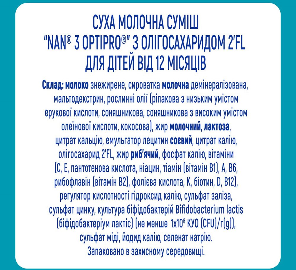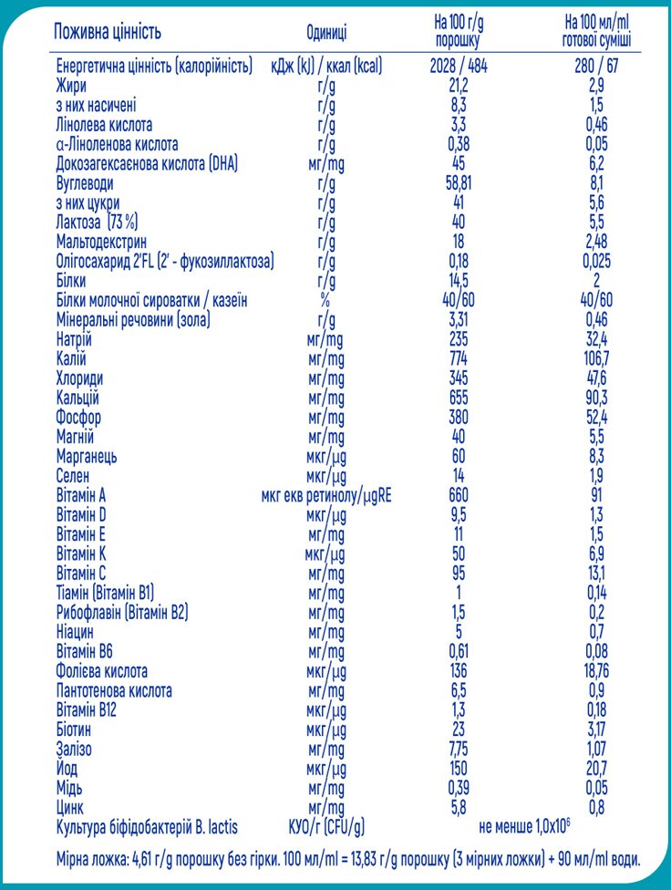 Склад: молоко знежирене, сироватка молочна демінералізована, мальтодекстрин, рослинні олії (ріпакова з низьким умістом ерукової кислоти, соняшникова, соняшникова з високим умістом олеїнової кислоти, кокосова), жир молочний, лактоза, цитрат кальцію, емульгатор лецитин соєвий, цитрат калію, олігосахарид 2'FL, жир риб'ячий, фосфат калію, вітаміни (С, Е, пантотенова кислота, ніацин, тіамін (вітамін В1), А, В6, рибофлавін (вітамін В2), фолієва кислота, К, біотин, D, В12), регулятор кислотності гідроксид калію, сульфат заліза, сульфат цинку, культура біфідобактерій (біфідобактеріум лактіс) (не менше 1х106 КУО (CFU)/г(g)), сульфат міді, йодид калію, селенат натрію. Запаковано в захисному середовищі.