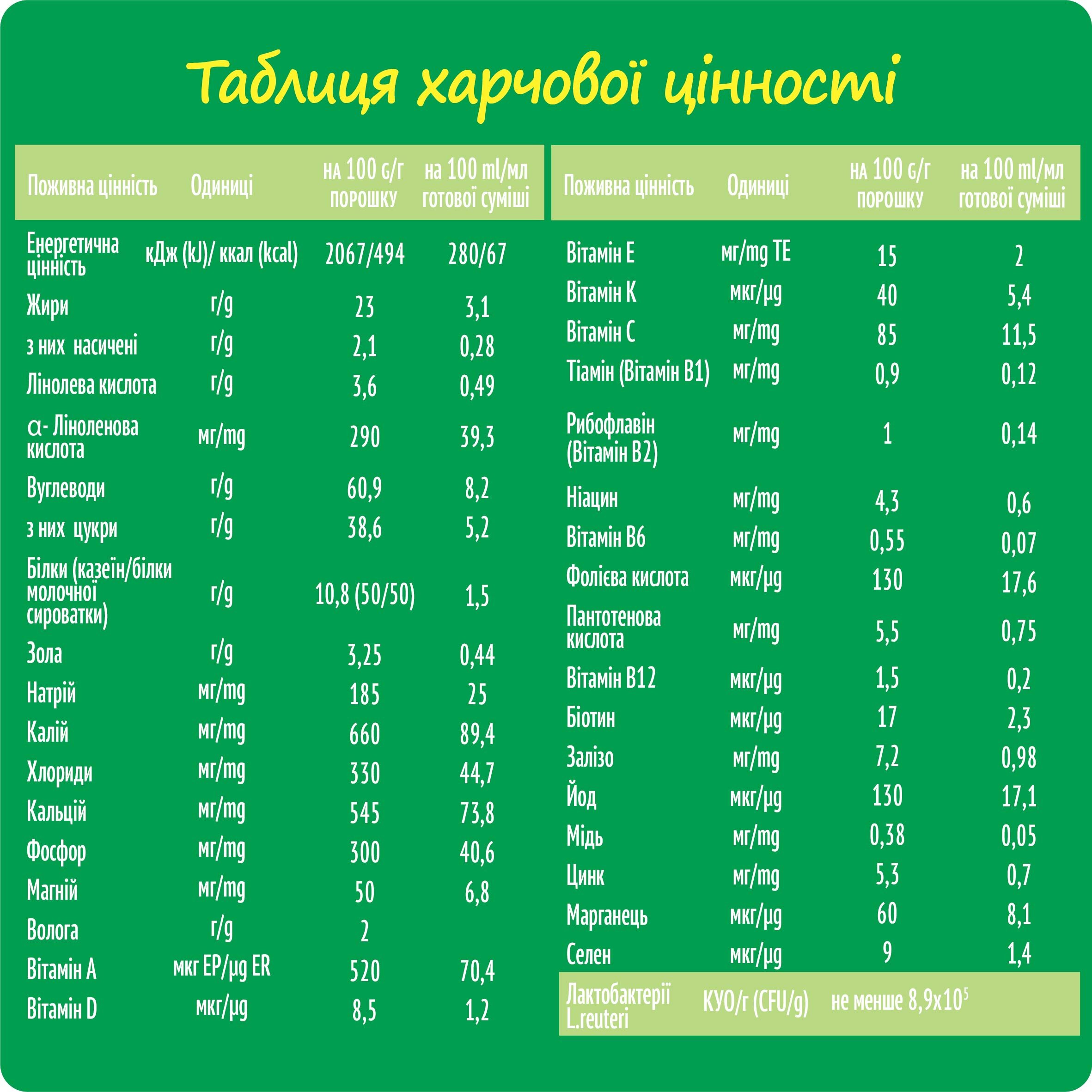 Склад: молоко знежирене (75%), мальтодекстрин, сироватка молочна, олії (соняшникова з високим вмістом олеїнової кислоти, кокосова, ріпакова з низьким вмістом ерукової кислоти, соняшникова), лактоза, цитрат кальцію, емульгатор (соєвий лецитин), цитрат натрію, цитрат калію, хлорид калію, фосфат кальцію, цитрат магнію, вітаміни (С, E, пантотенова кислота, ніацин, тіамін (В1), А, В6, рибофлавін (В2), фолієва кислота, K, біотин, D, В12), фосфат калію, сульфат заліза, сульфат цинку, культура лактобактерій Lactobacillus Reuteri (не менш ніж 8.9х105 КУО/г (CFU g)), сульфат міді, йодид калію, селенат натрію Упаковано в захисному середовищі.