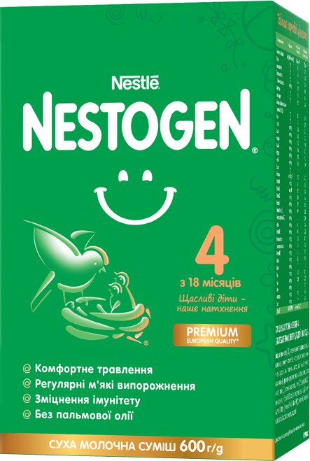 Суміш Nestogen 4 спеціально розроблена для забезпечення збалансованого здорового харчування й комфортного травлення малюка. Суміш Nestogen 4 з лактобактеріями L. Reuteri сприяє поліпшенню моторики кишківника, формуванню регулярного м'якого стулу, становленню здорової мікрофлори. Суміш Nestogen 4 — це збалансований продукт, який замінює коров'яче молоко в раціоні дитини старше 18 місяців. Дитяча суміш Nestogen 4 доповнює раціон дитини поживними речовинами, потрібними для її оптимального росту та розвитку.