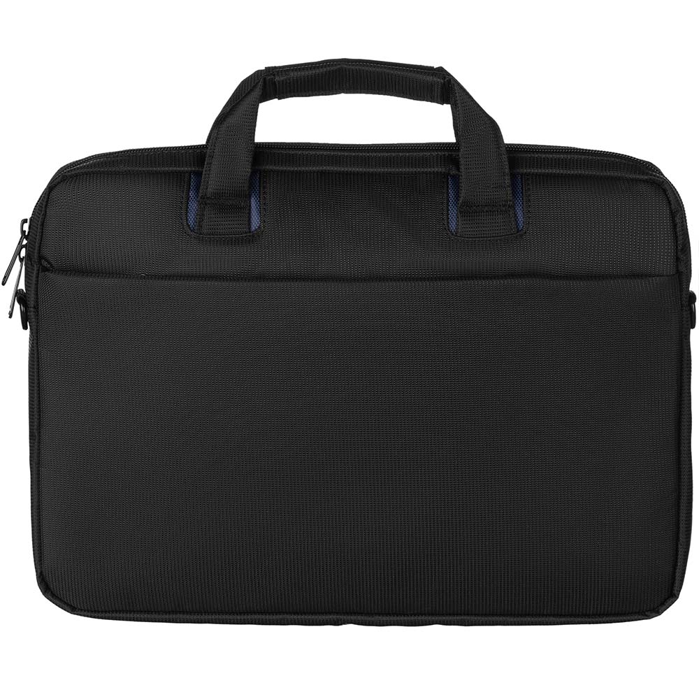 Сумка чорного кольору з синіми вставками для повсякденного використання. Виконана з водовідштовхуючого нейлону в комбінації з матеріалом дна і стінок, що амортизує поштовхи та удари.