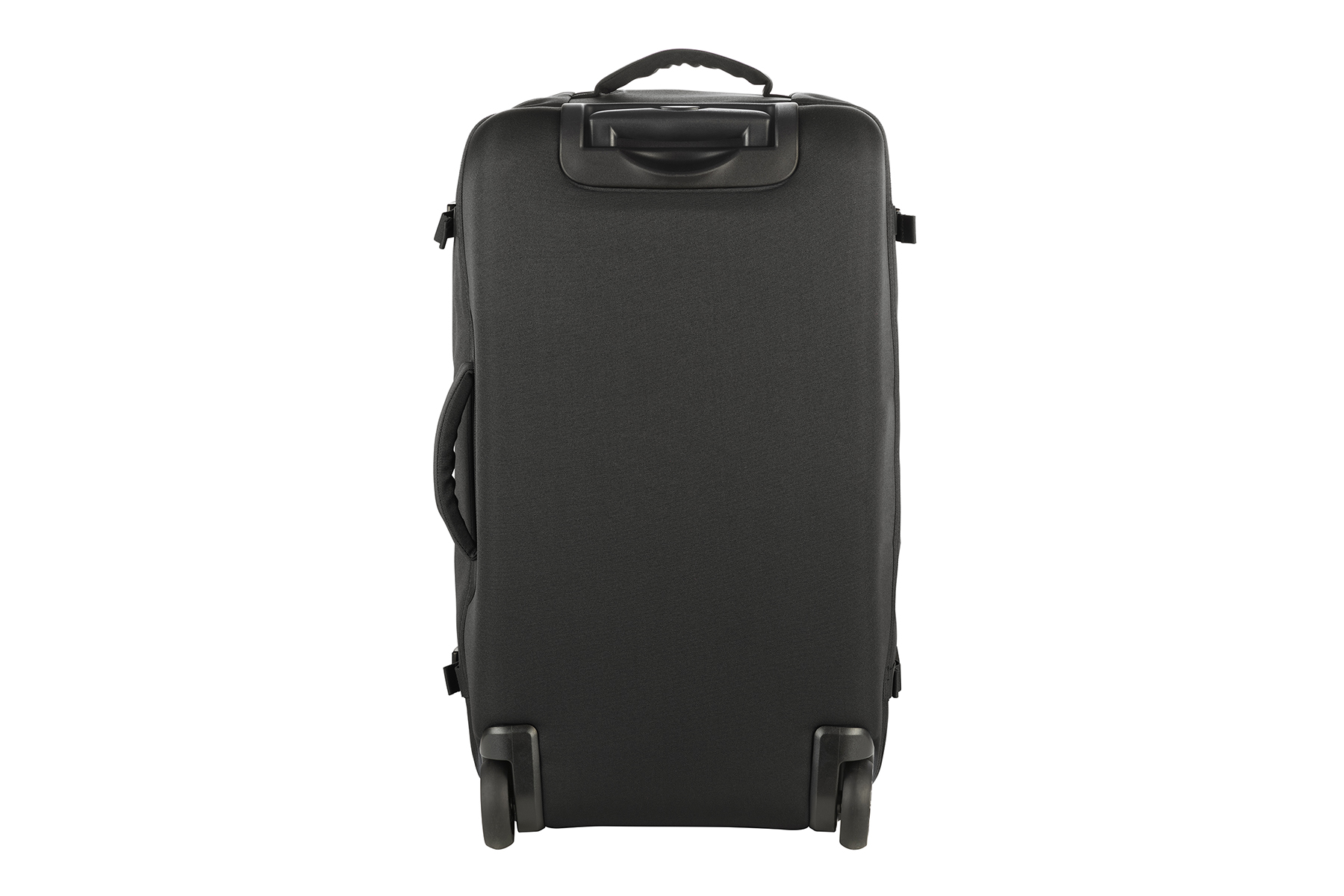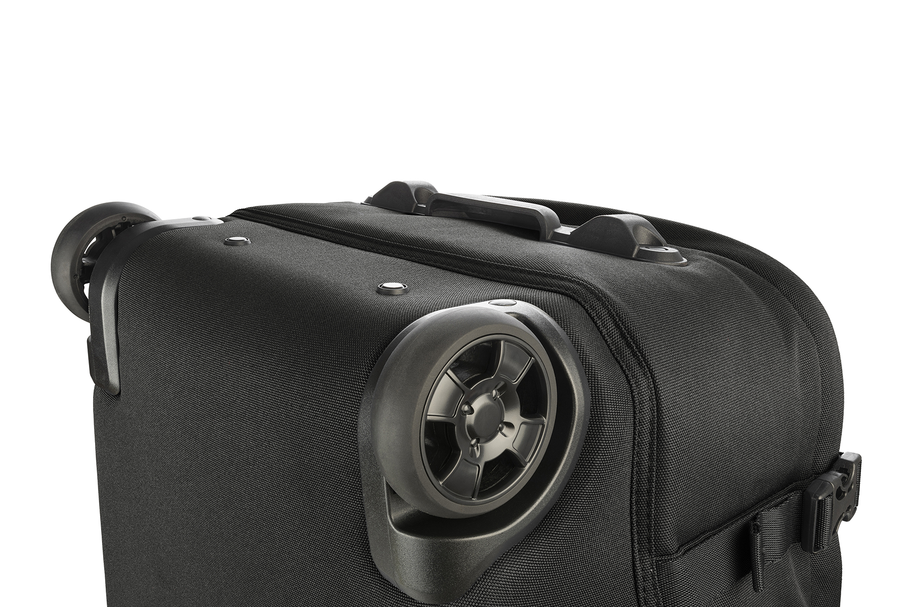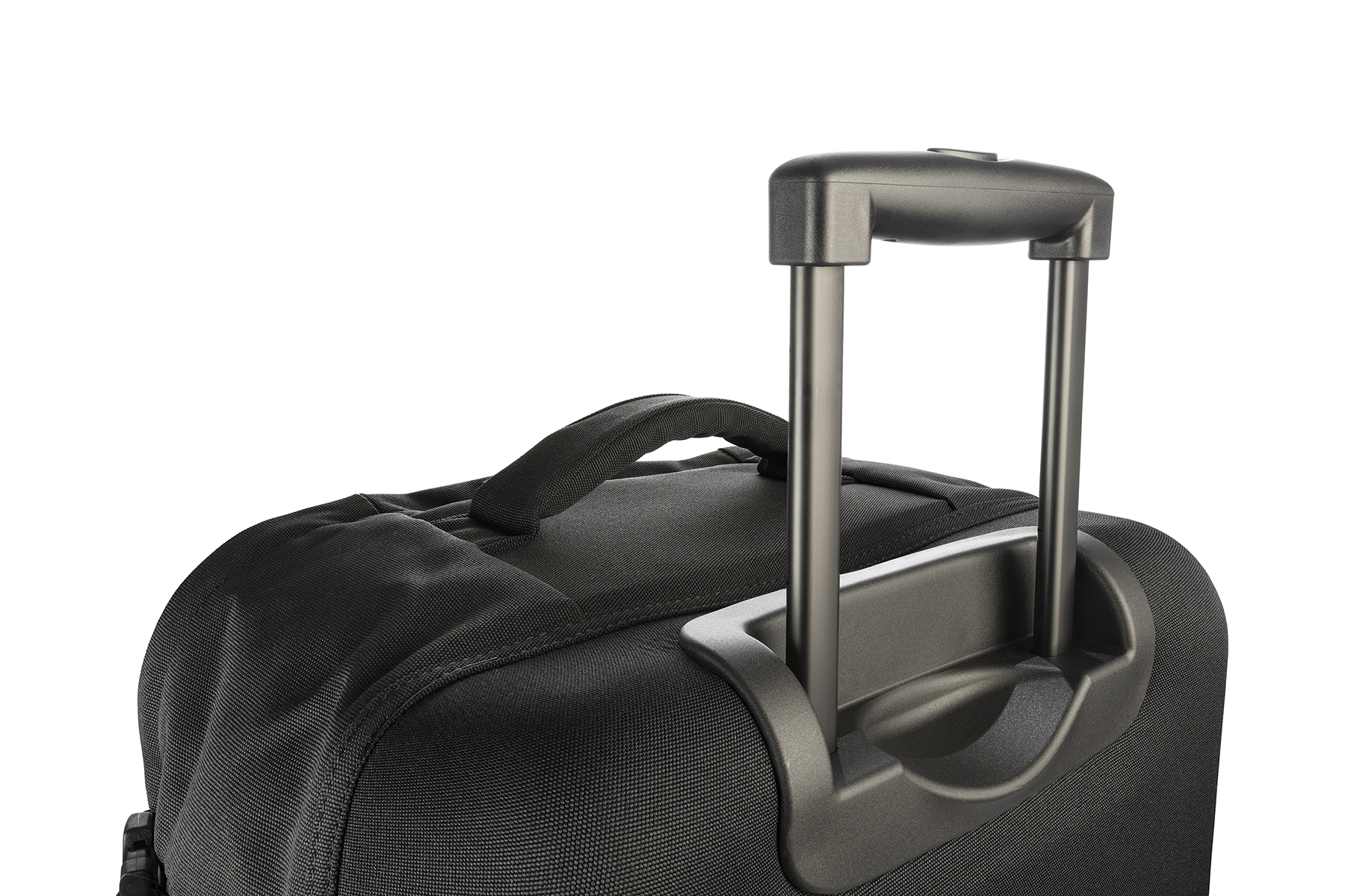 Двоколісна дорожня сумка з телескопічною ручкою з лінійки TUGO Trolley M. Основа та задня панель виготовлені з термоформованого матеріалу, і надають жорсткості всій конструкції. Велике головне відділення, що вміщує до 45 літрів корисного об'єму, і оснащене еластичними компресійними ременями для забезпечення фіксації вашого одягу/поклажі. На передній панелі розташовані дві просторі, швидкодоступні кишені на блискавці.Зовні розташовані дві зручні м'які ручки, зверху та збоку, що полегшує захоплення та перенесення. Кришка головного відсіку відкривається блискавкою з двома бігунками.