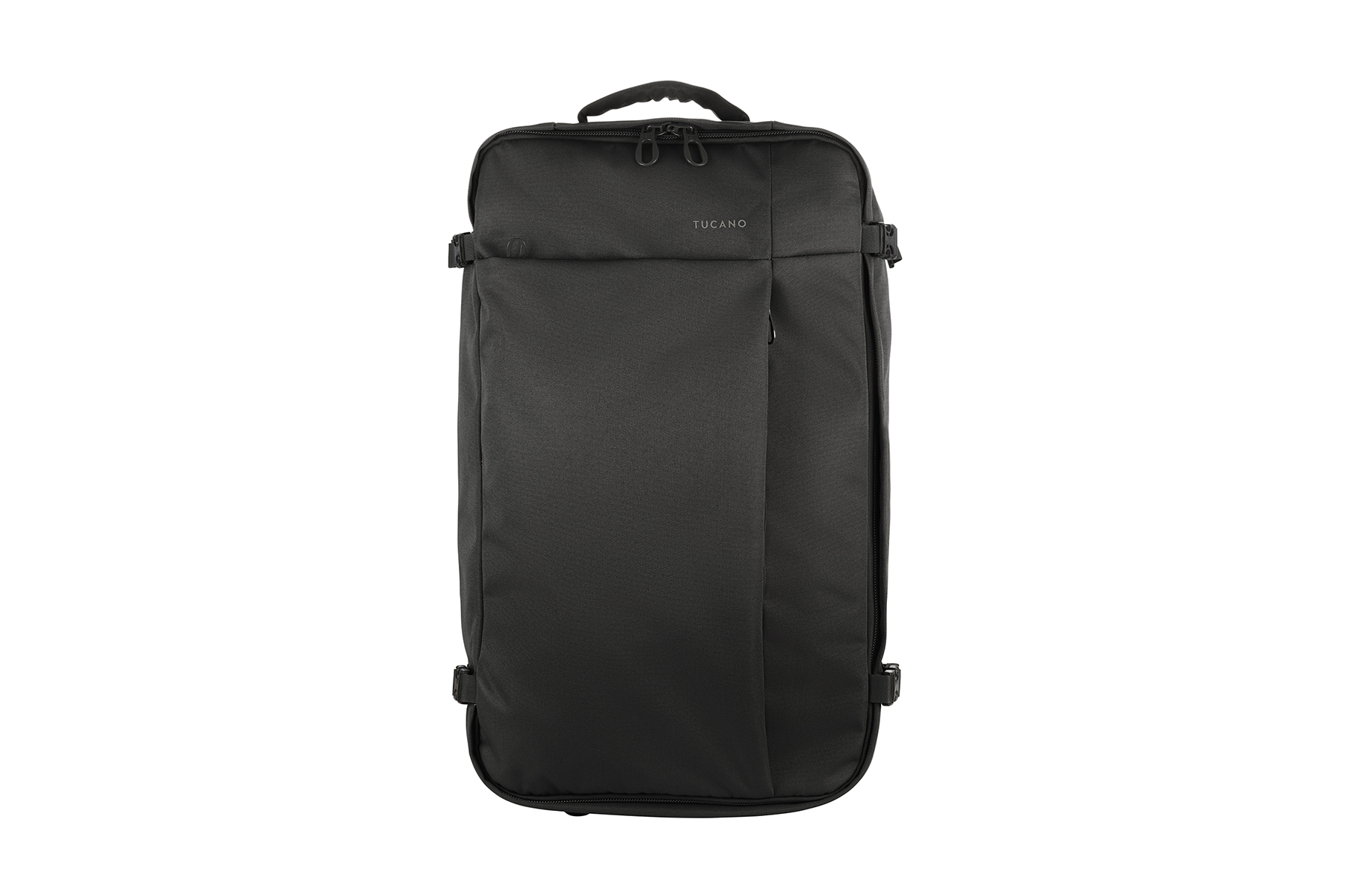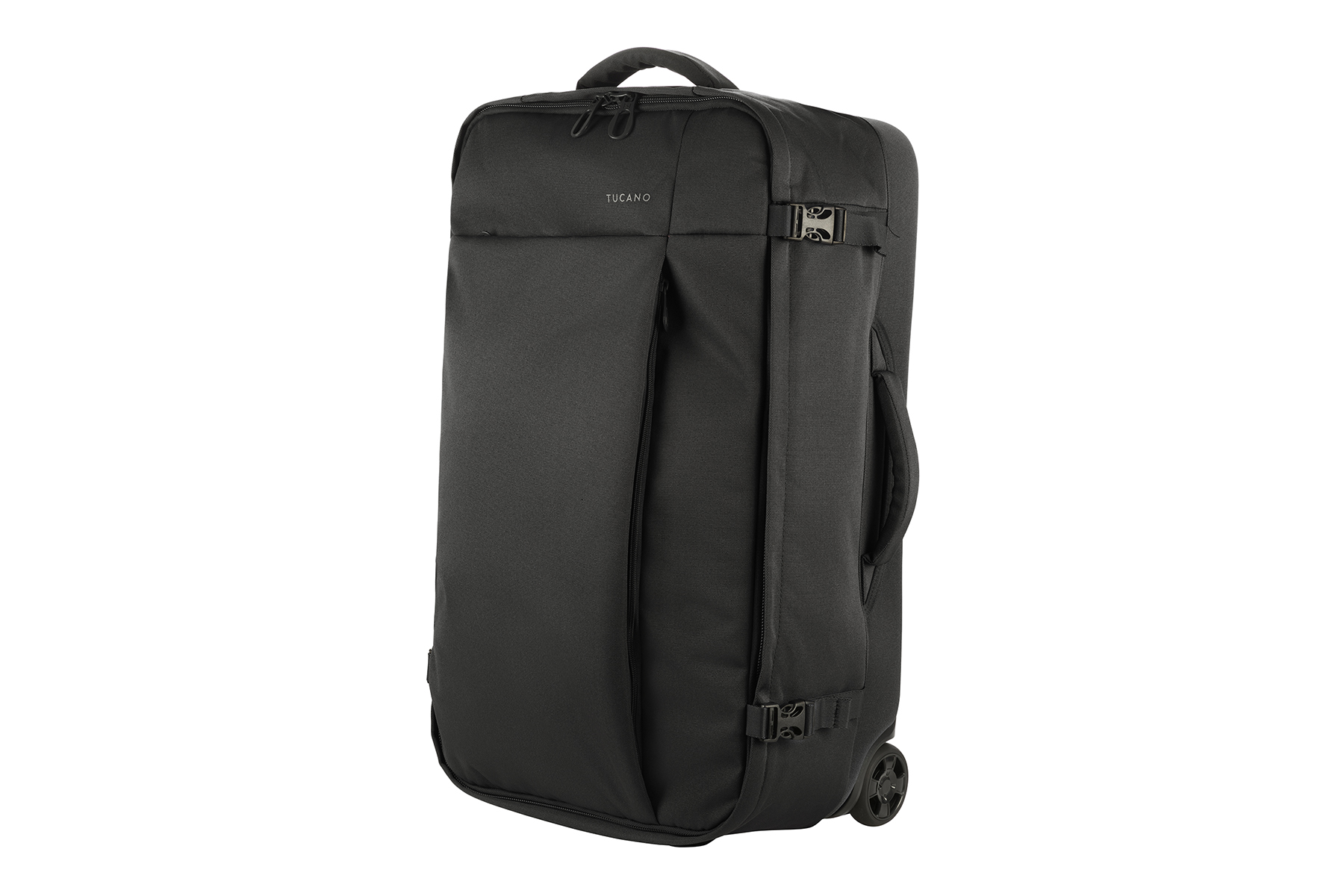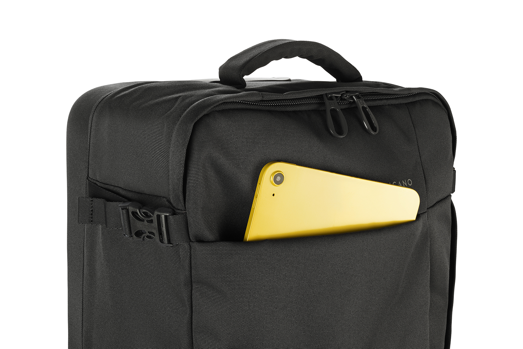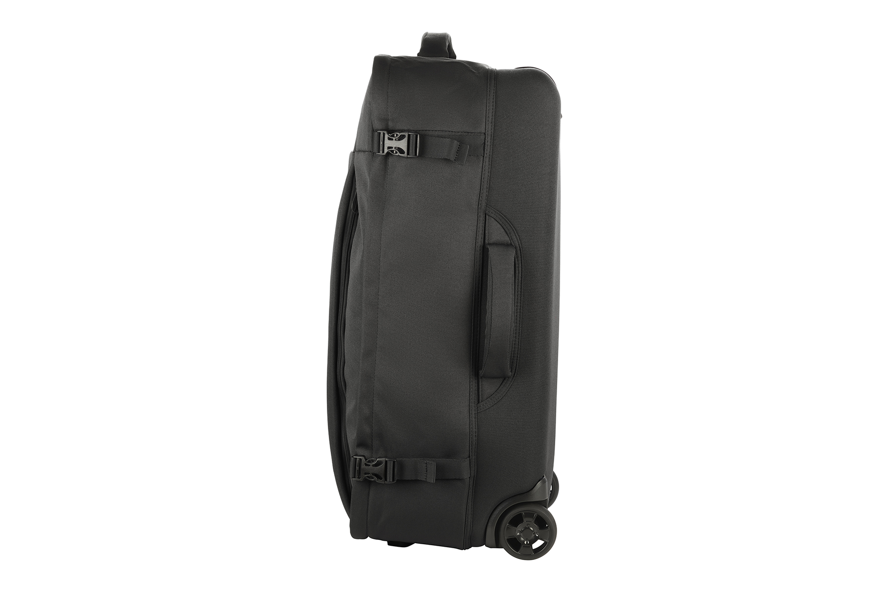 Двоколісна дорожня сумка з телескопічною ручкою з лінійки TUGO Trolley M. Основа та задня панель виготовлені з термоформованого матеріалу, і надають жорсткості всій конструкції. Велике головне відділення, що вміщує до 45 літрів корисного об'єму, і оснащене еластичними компресійними ременями для забезпечення фіксації вашого одягу/поклажі. На передній панелі розташовані дві просторі, швидкодоступні кишені на блискавці.Зовні розташовані дві зручні м'які ручки, зверху та збоку, що полегшує захоплення та перенесення. Кришка головного відсіку відкривається блискавкою з двома бігунками.