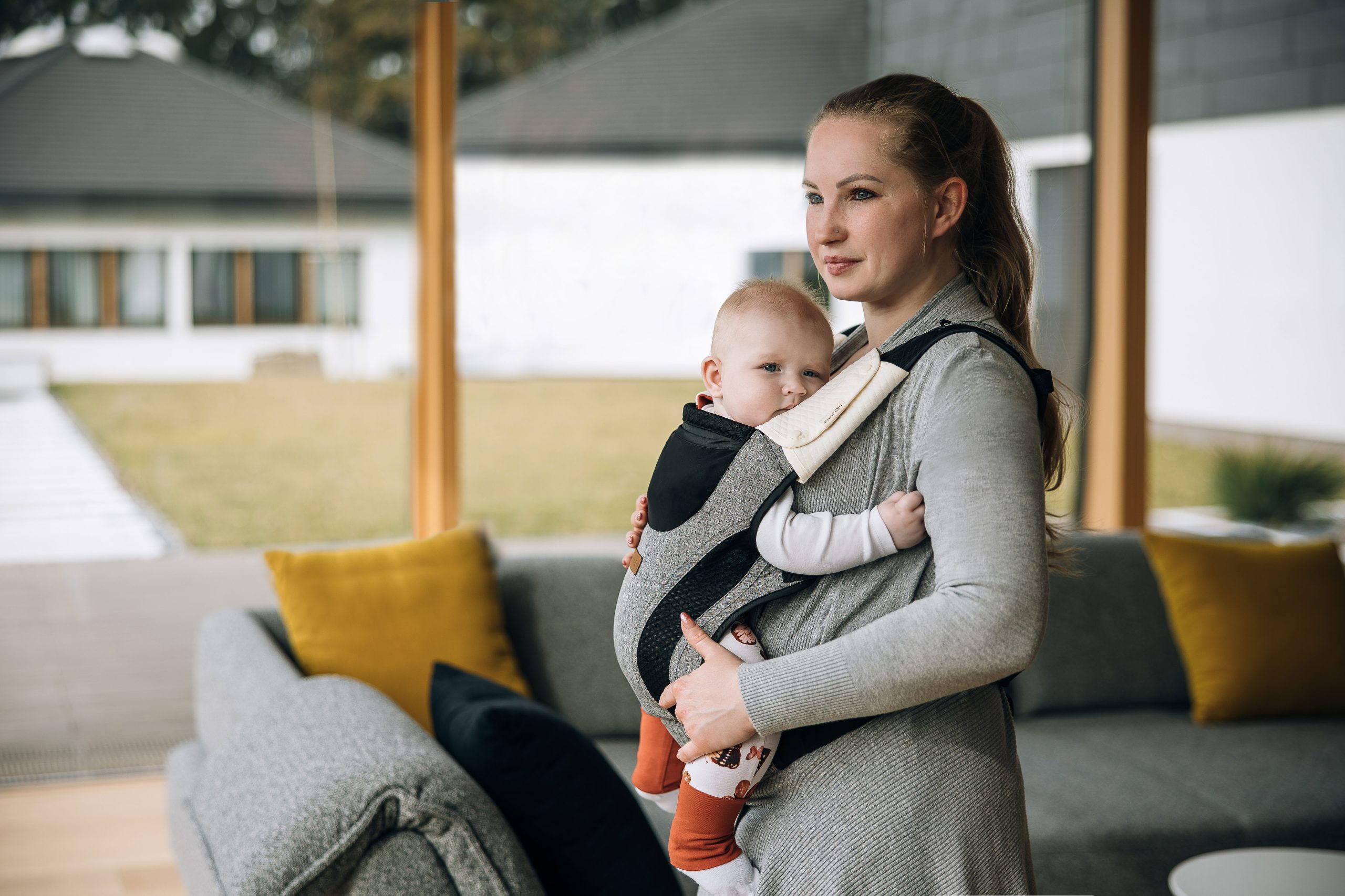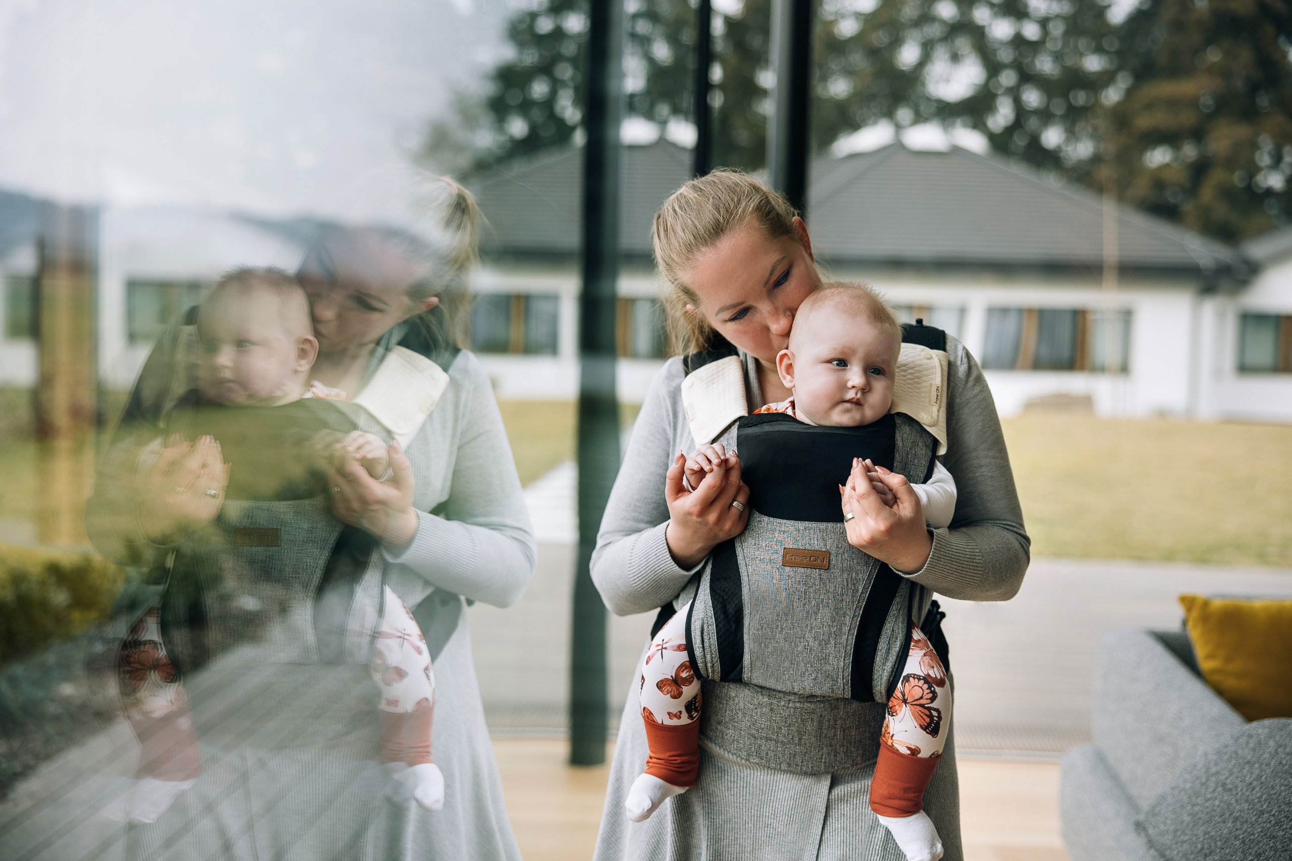 Протягом перших місяців, коли суглоби таза малюка все ще розвиваються, важливо носити малюка в правильному положенні. Це положення не лише найкраще для розвитку тазових кісток та хребта, але і найзручніше для малюка. Підтримка та положення ніг утримують хребет малюка в правильному положенні. Для більш комфортного носіння та відпочинку на вашому коліні, підтримка голови запобігає її похибанню. Вона забезпечує правильний спосіб носіння, оскільки ноги дитини залишаються в ергономічному положенні М.