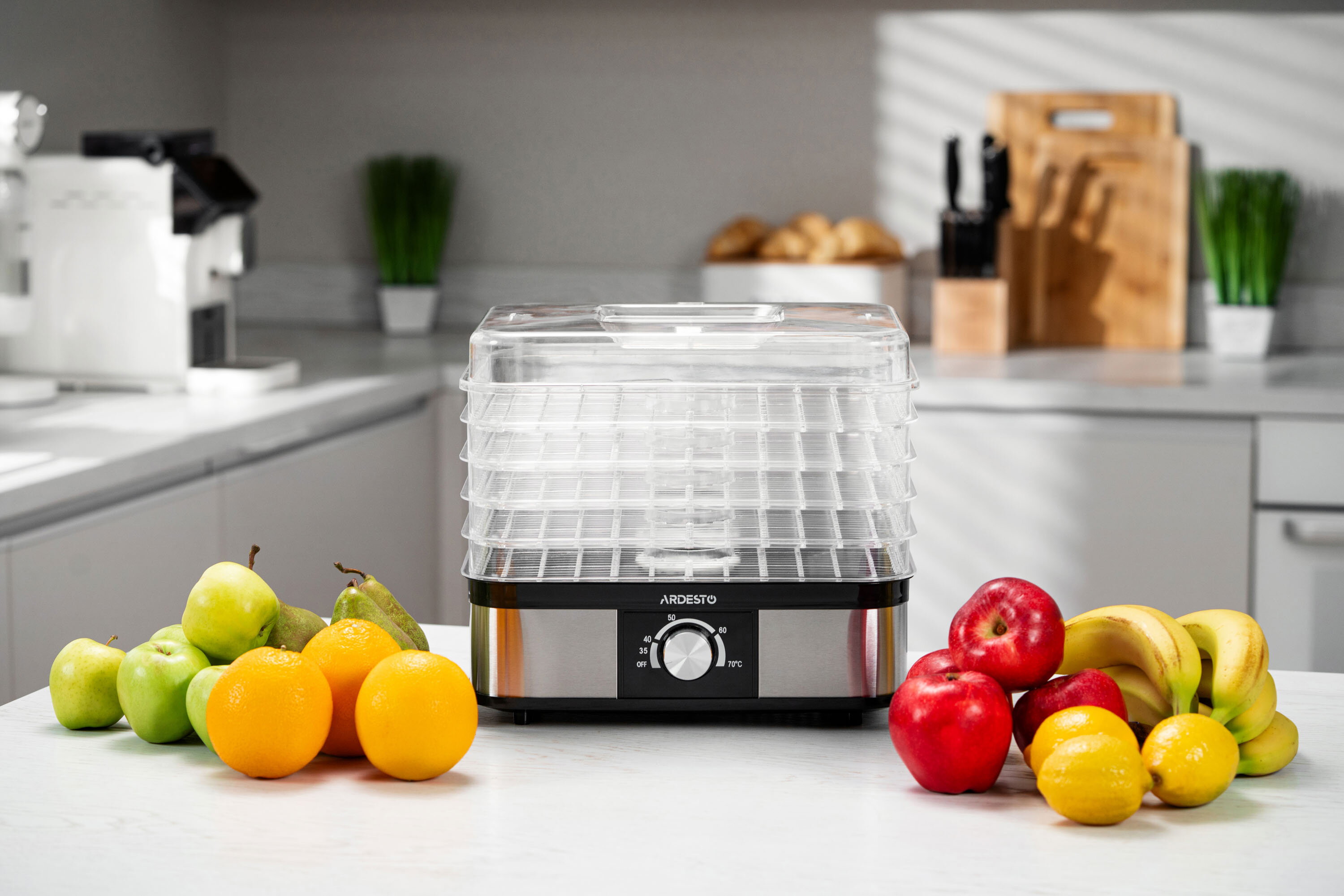 Сушарка для продуктів ARDESTO – це надійний та функціональний пристрій потужністю 245 Вт. Оснащено 5 просторими піддонами розміром 32 × 24 × 3,5 см, зумовлюючи можливість одночасного сушіння різних продуктів. Із температурним діапазоном від 35 до 70 °C забезпечено гнучкість налаштувань, а з механічним керуванням спрощено використання. Захист від перегрівання та світловий індикатор роботи додають пристрою безпеки та зручності. Завдяки прозорій конструкції процес сушіння буде повсякчас під контролем. Витончений дизайн, у якому поєднано чорний пластик із елементами з нержавіючої сталі, підкреслює естетику пристрою, роблячи його вдалим доповненням до будь-якої кухні.