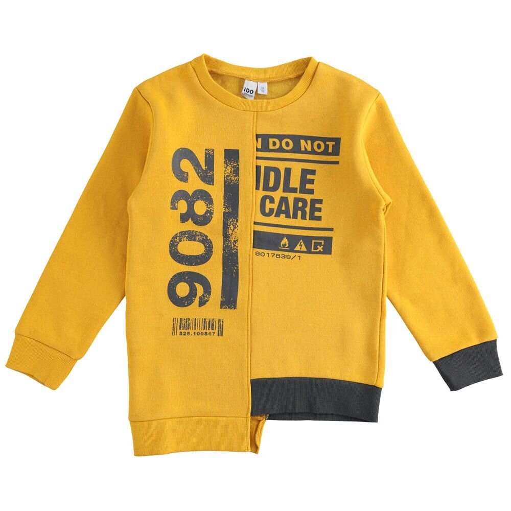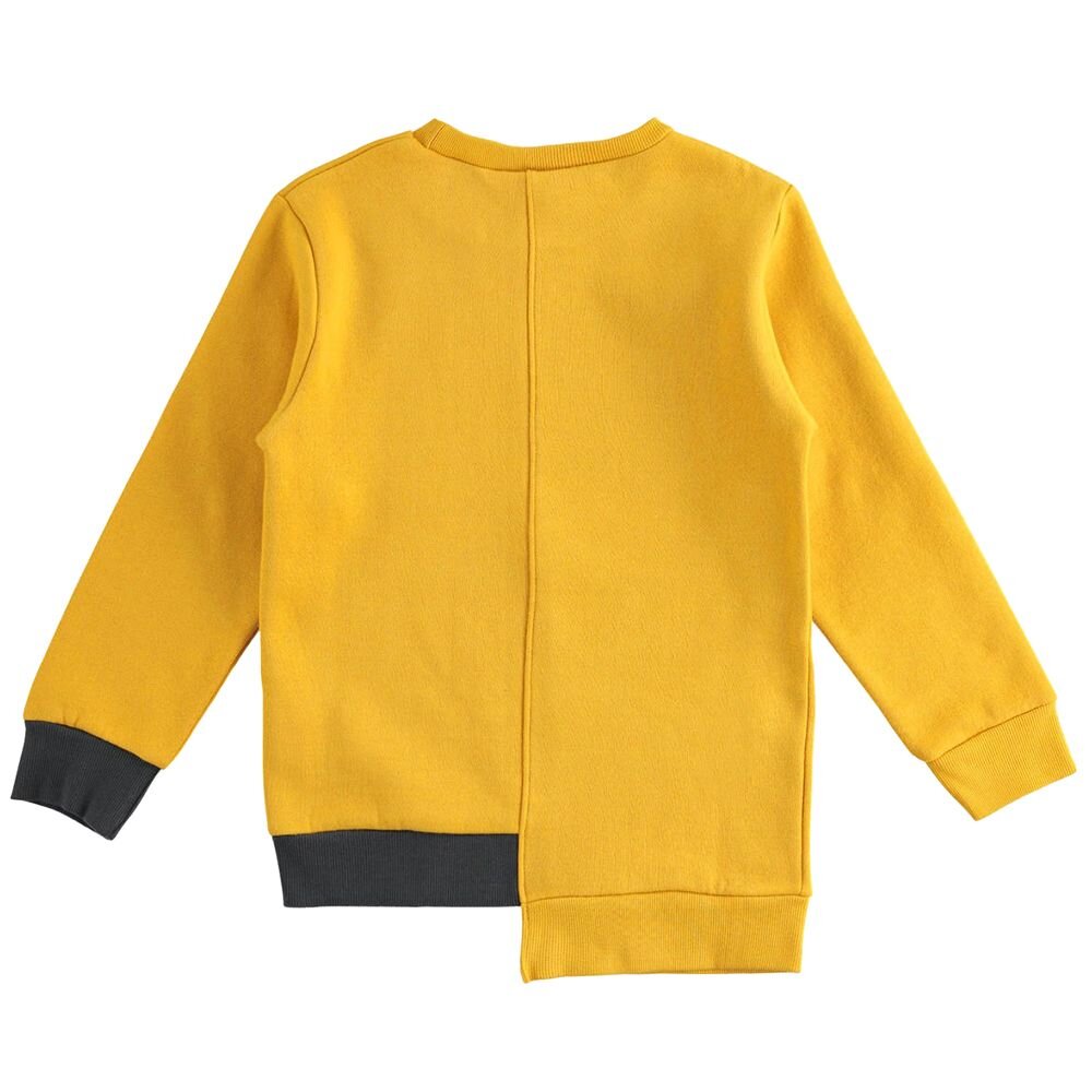 Оригінальний трикотажний светр модного гірчичного кольору. Має круглу горловину та рукава з широкими манжетами-гумками. Ефектність виробу придає асиметрія: права пілочка та частина спинки трохи довші. Лівий манжет та ліва пілочка оброблені темно-сірою тканиною. У тому ж кольорі виконані принтовані написи. Склад: 80% бавовна, 20% поліестер.