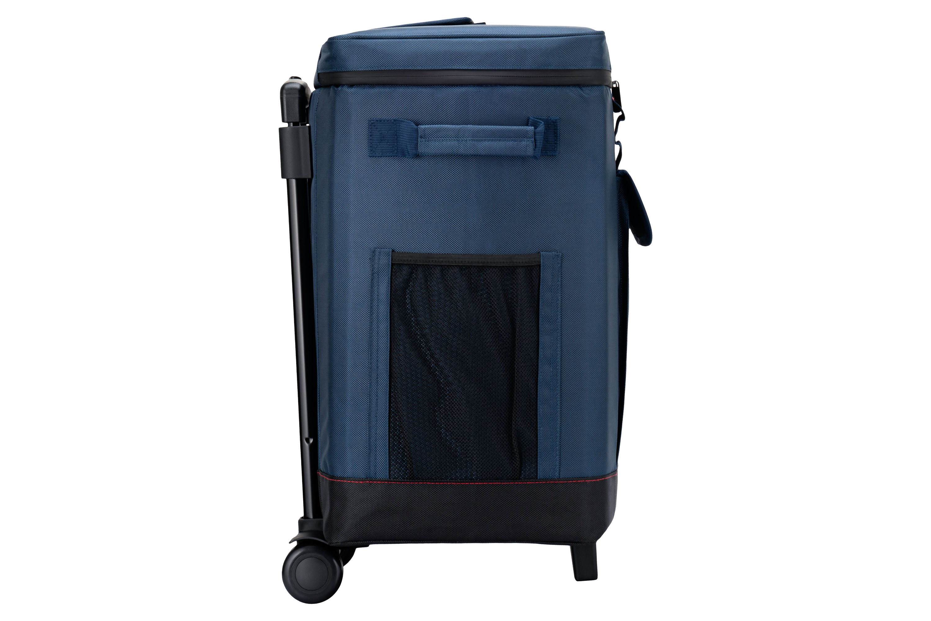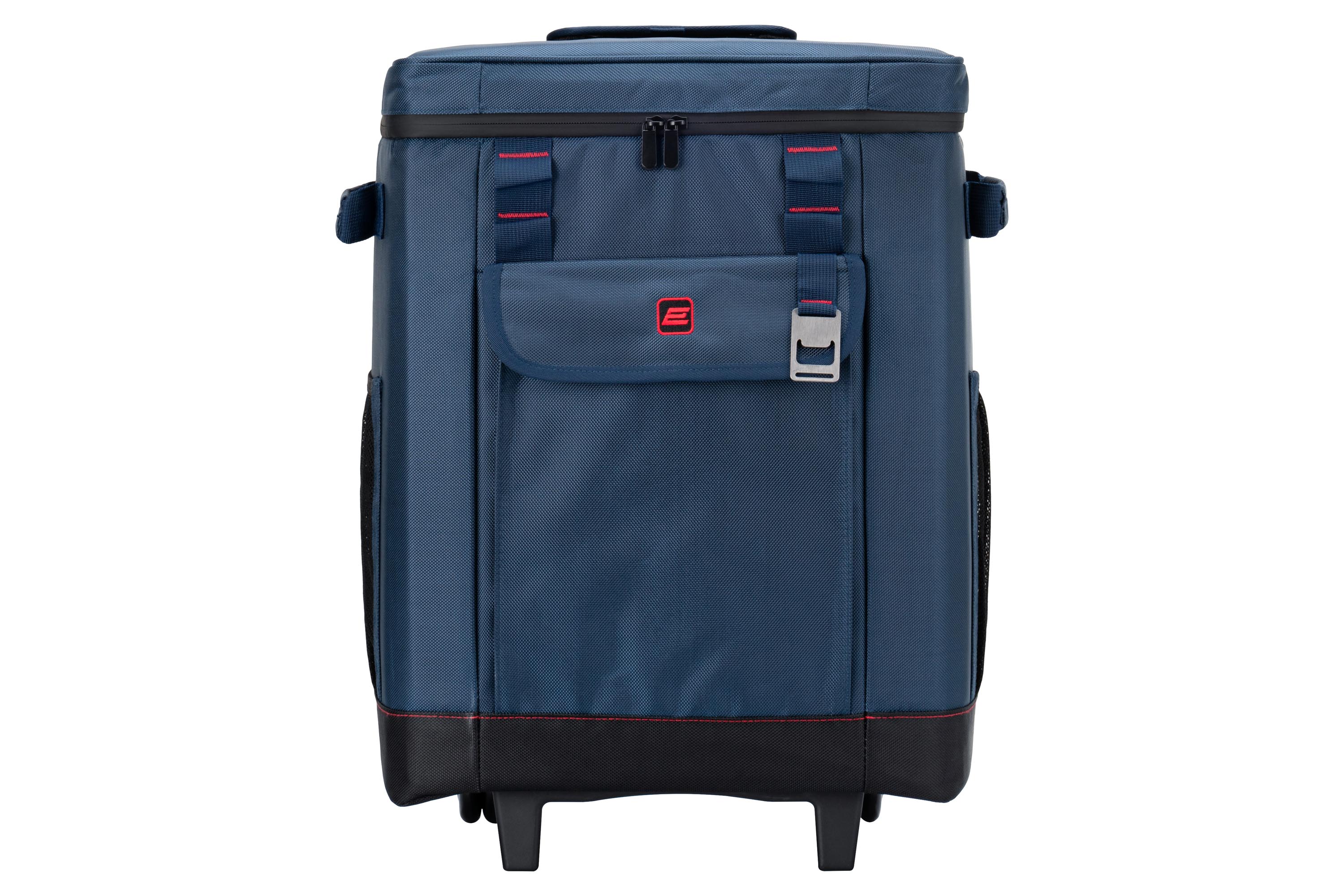 Термосумка на коліщатках темно-синього кольору з чорними вставками об’ємом 50 л. Призначена для збереження температури (холодної чи гарячої) напоїв і продуктів. Виготовлено з водовідштовхувального поліестеру. Передбачено телескопічну ручку та ручку на кришці. На лицьовому боці розміщено кишеню на липучці, а також відкривачку для пляшок. Усі карабіни, петлі та замки блискавок – металеві. Зручне та надійне рішення для транспортування. Розмір (ш×в×г): 38 x 49.5 x 27 см.