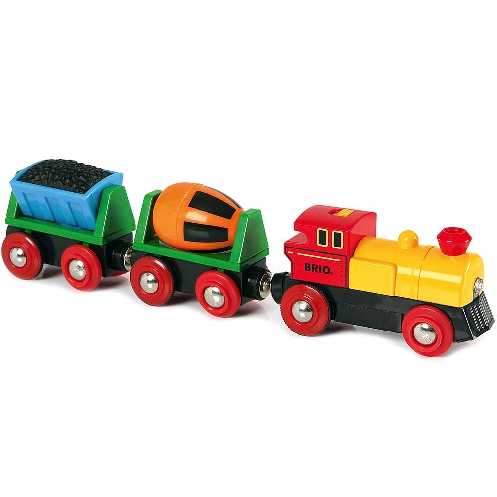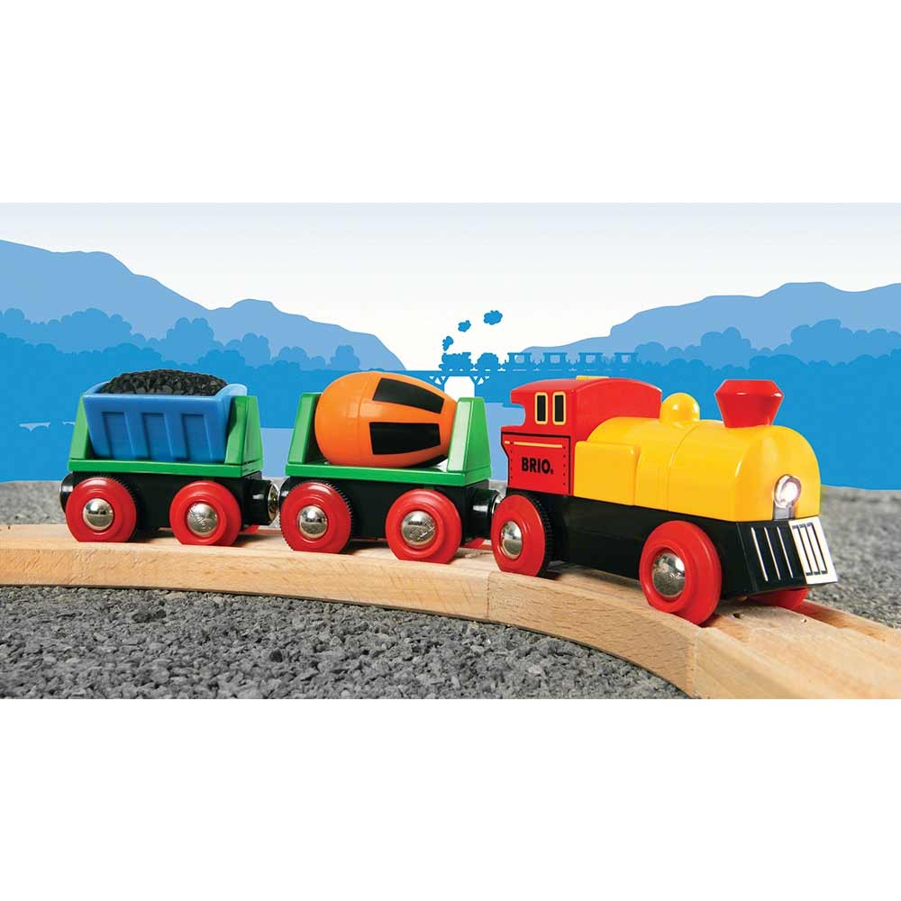 Товарний паровоз на батареях для залізниці BRIO (33319) - чудова можливість доповнити свою колекцію BRIO. Запускайте локомотив по Вашому місту. Приєднуйте вагони за допомогою вбудованих магнітів. Паровоз може не тільки самостійно їздити рейками, а й висвітлювати собі шлях. Спостерігайте, як обертається бетонозмішувач, а контейнер з вугіллям розгойдується при русі рейками.