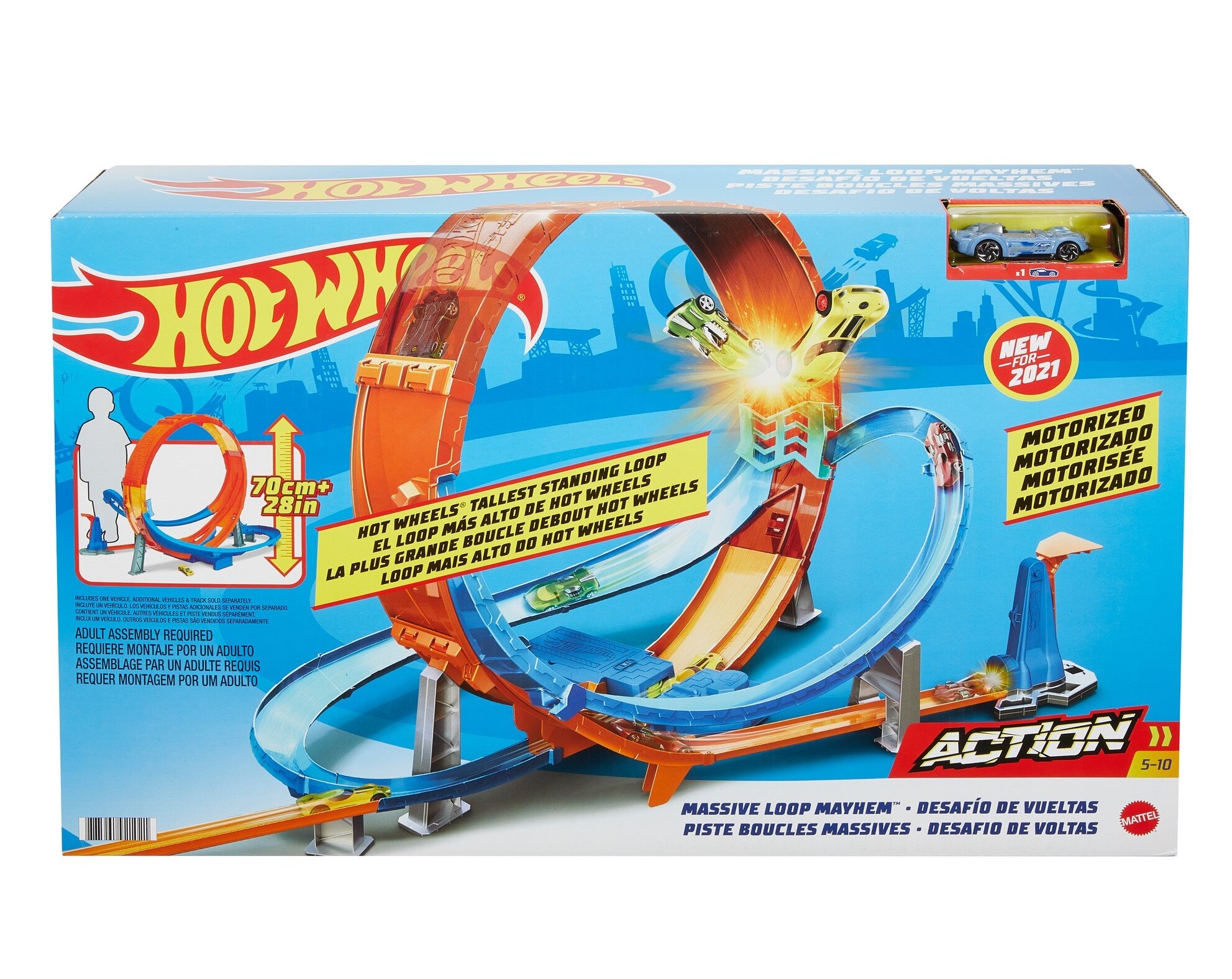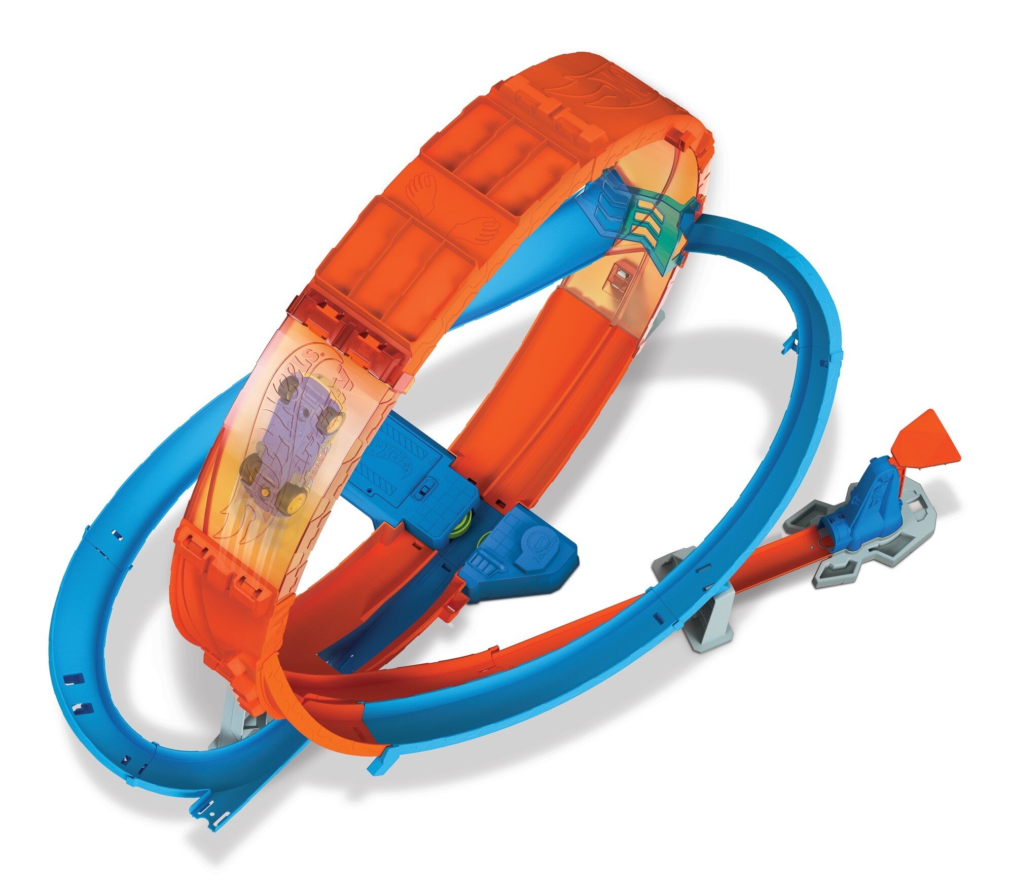Комплектація: трек із гігантською петлею; пусковий механізм; машинка в масштабі 1:64. Живлення: батарейки типу 4D (немає в комплекті).