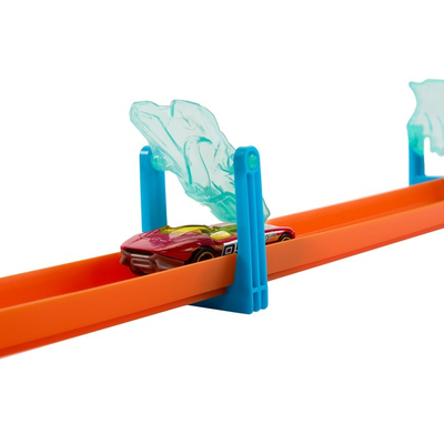Набір містить 10 компонентів для будівництва треків. Оскільки всі деталі розміщуються в інноваційному контейнері для зберігання, тепер прибирання – це також частина гри. Комплект містить одну машинку Hot Wheels, а деталі можна використовувати для гри з іншими наборами.
