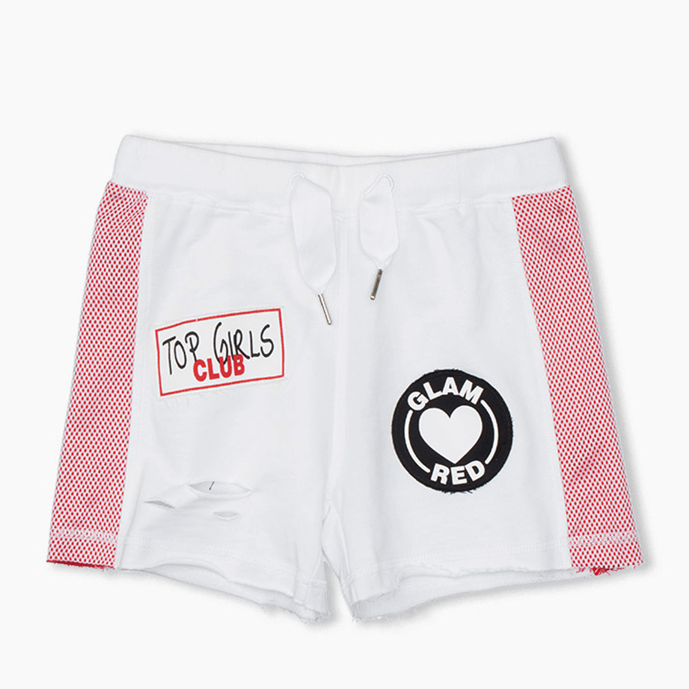 Стильні короткі шорти iDO Glam Red в стилі спорт-шик для дівчинки 10 - 11 років. Пошиті з легкого білого трикотажу (100% бавовна). Модними модель роблять біло-червоні лампаси, що імітують сітку, принти, прорізи та необроблений низ. На талії шорти регулюються білим широким шнурком. Річ, яку ваша дівчина не захоче знімати!