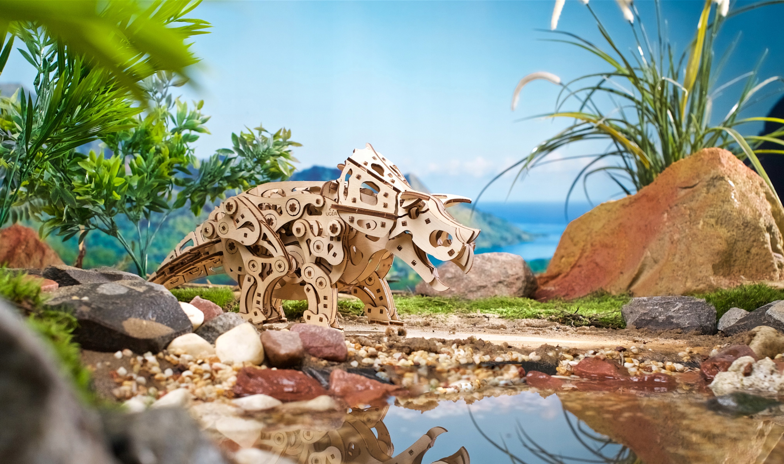 Тривимірний пазл Ukrainian Gears Трицератопс — динамічна, механічна дерев’яна модель величезного травоїдного динозавра пізнього крейдяного періоду, яку ви можете скласти власноруч.