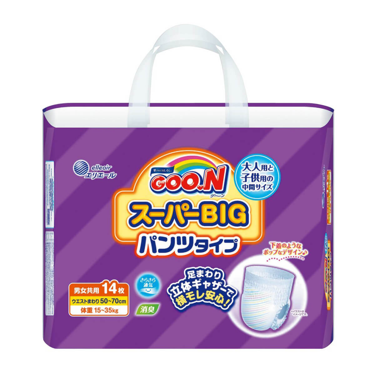 Японські трусики-підгузки GOO.N 15-35 кг размер SuperBig XXXL унисекс створені, щоб малюк був здоровий, а його шкіра залишалася сухою та гладенькою! Мають м'яку сітчасту зовнішню поверхню, через яку всередину трусиків пропускається повітря, а назовні виводиться піт. Мембранна плівка забезпечує абсолютну повітропроникність гігієнічного засобу. Підгузки "Гун" дарують малюкам максимальну ніжність за рахунок внутрішнього шару, неймовірного по своїй м'якості. Рідина миттєво всмоктується в 3D-поверхню і замикається у суперабсорбенті. Хвиляста поверхня підгузника з вітаміном Е тільки злегка торкається ніжної шкіри дитини, що попереджає появу подразнень і попрілостей. Є індикатор-нагадування про зміну підгузника. Передбачена нейтралізація неприємного запаху. Ще одна перевага дитячих трусиків - комфортна посадка без слідів на шкірі. З оновленої упаковки посміхаються малюки, які знають, що Goo.N - знак турботи і любові!