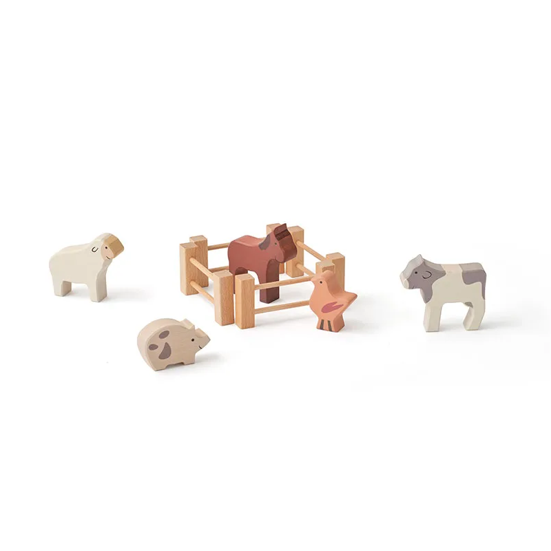 Зустрічайте найкрутіших сільськогосподарських тварин! Курочка, вівця, свинка, корова та кінь. Усі вони живуть разом на фермі. Завдяки чотирьом дерев'яним огорожам, що входять у комплект, ви можете створити свій власний затишний двір на фермі. Разом з Kid's Concept - AIDEN Farm (продається окремо) тварини створюють незамінний дует, який дозволяє втілювати уяву у грі на фермі.