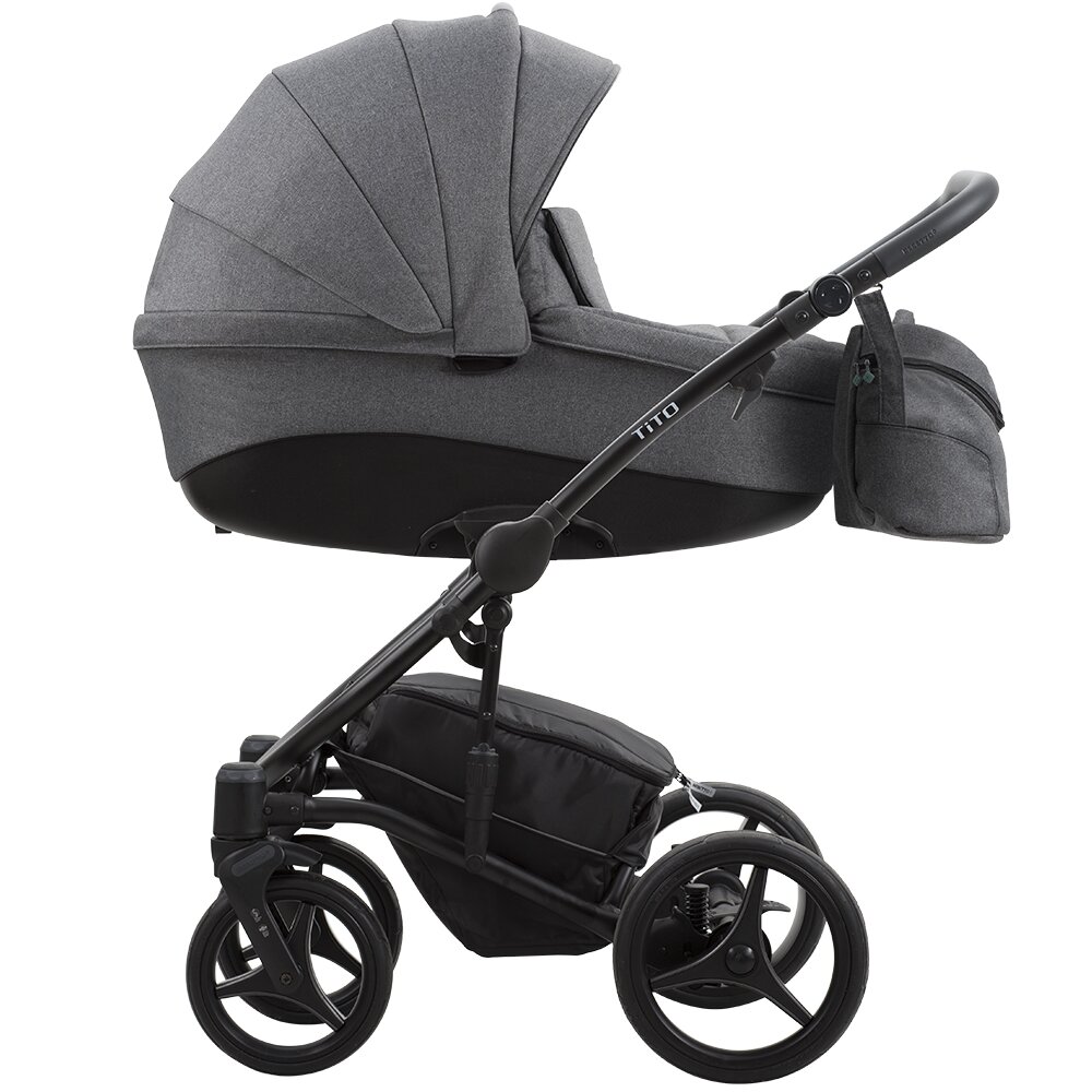 Особливості шасі коляски Bebetto Tito New 2020: рама з алюмінієвого сплаву; легко складається; автоблокування рами для захисту від ненавмисного складання; регульована по висоті ручка; ручка з еко-шкіряною оббивкою; швидкоз'ємні непробивні колеса Flexy Wheels; 6-ступінчаста амортизація; бічні амортизатори на рамі з регулюванням жорсткості; пружинна підвіска задніх коліс з регулюванням жорсткості; на передніх колесах антишокова амортизація SAS; передні колеса поворотні на 360 градусів з можливістю блокування прямо; система пам'яті напрямку DMS фіксує положення поворотних коліс при відриві від землі; гальмо Stop&Go з педаллю-гойдалкою на задній осі.