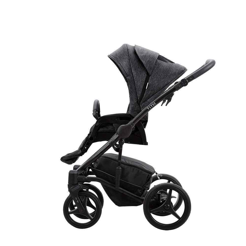 Особливості шасі коляски Bebetto Tito New 2020: рама з алюмінієвого сплаву; легко складається; автоблокування рами для захисту від ненавмисного складання; регульована по висоті ручка; ручка з еко-шкіряною оббивкою; швидкоз'ємні непробивні колеса Flexy Wheels; 6-ступінчаста амортизація; бічні амортизатори на рамі з регулюванням жорсткості; пружинна підвіска задніх коліс з регулюванням жорсткості; на передніх колесах антишокова амортизація SAS; передні колеса поворотні на 360 градусів з можливістю блокування прямо; система пам'яті напрямку DMS фіксує положення поворотних коліс при відриві від землі; гальмо Stop&Go з педаллю-гойдалкою на задній осі.