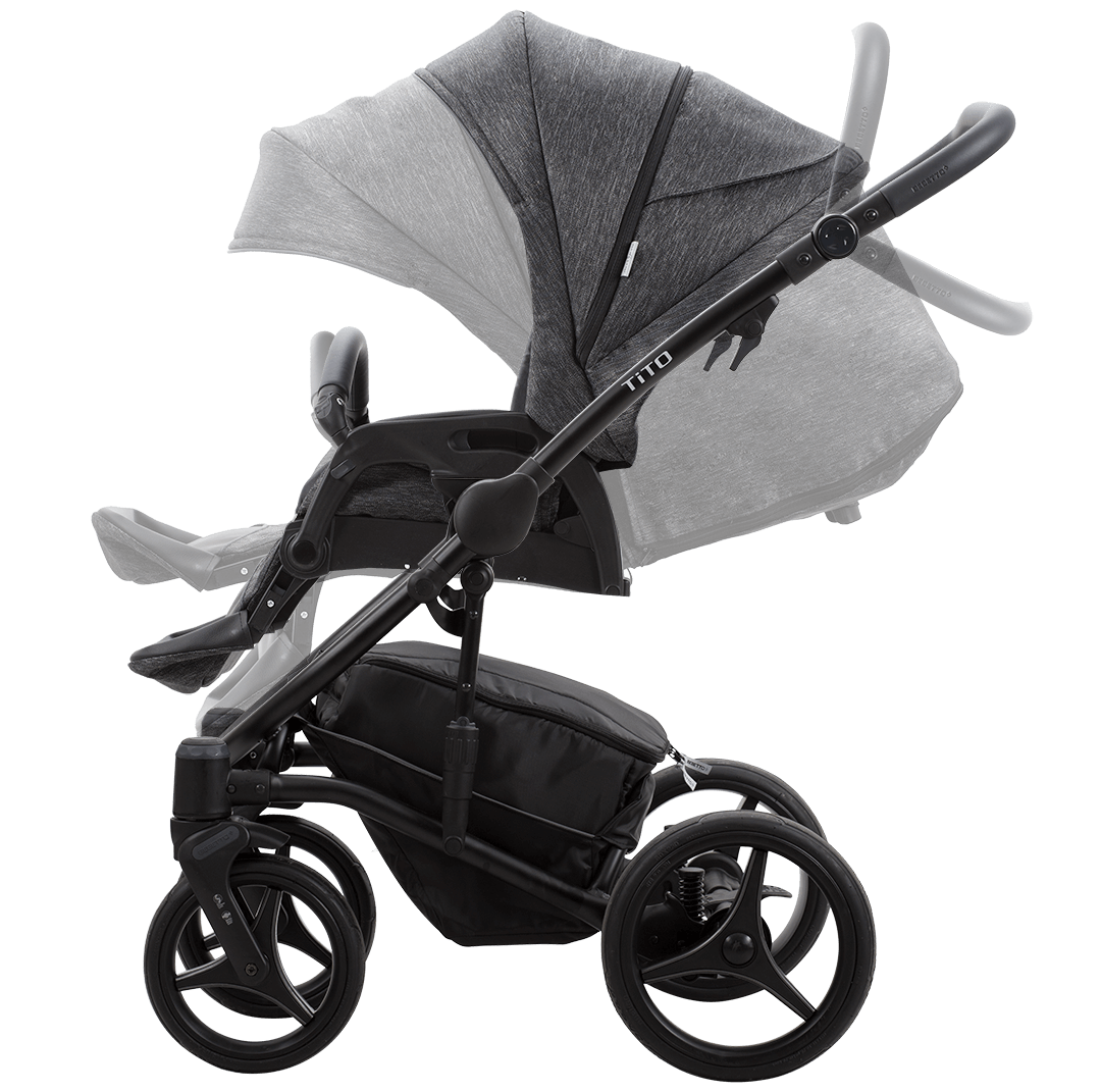 Коляска Bebetto Tito New з встановленим прогулянковим сидінням є надзвичайно функціональним транспортом для малюків від 6 місяців. Сидіння надає можливість перевозити дитину як обличчям до мами, так й обличчям вперед. Підпружинений механізм автоблокування у капюшоні полегшує його настроювання. Прогулянковий блок оснащений бампером, який швидко знімається завдяки зручним кнопкам.