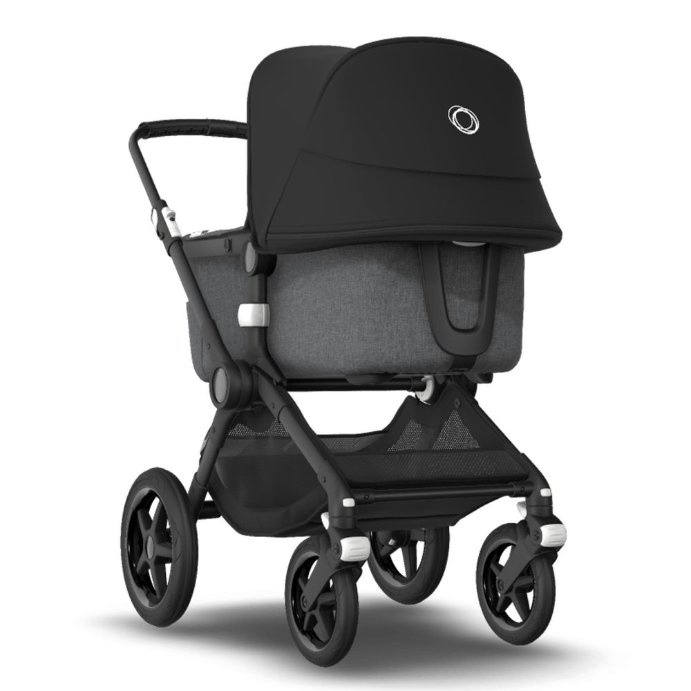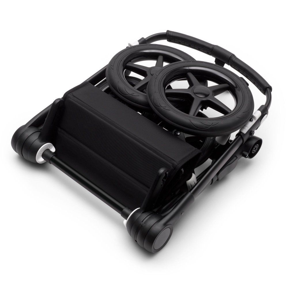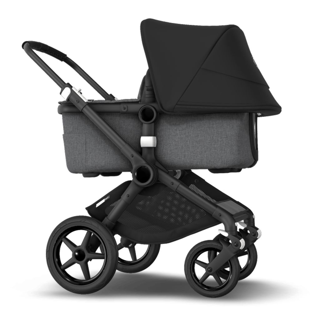 Комплектація Bugaboo Fox 2: шасі, рама сидіння і відповідні деталі, рама люльки, колеса, корзина під сидінням 30л/10кг, ручка для перенесення, дощовик, тканинний комплект для люльки, тканинна основа сидіння, капюшон, комплект накладок на колісні диски, 2 накладки з екошкіри на ручку коляски і 1 накладка на ручку для перенесення.