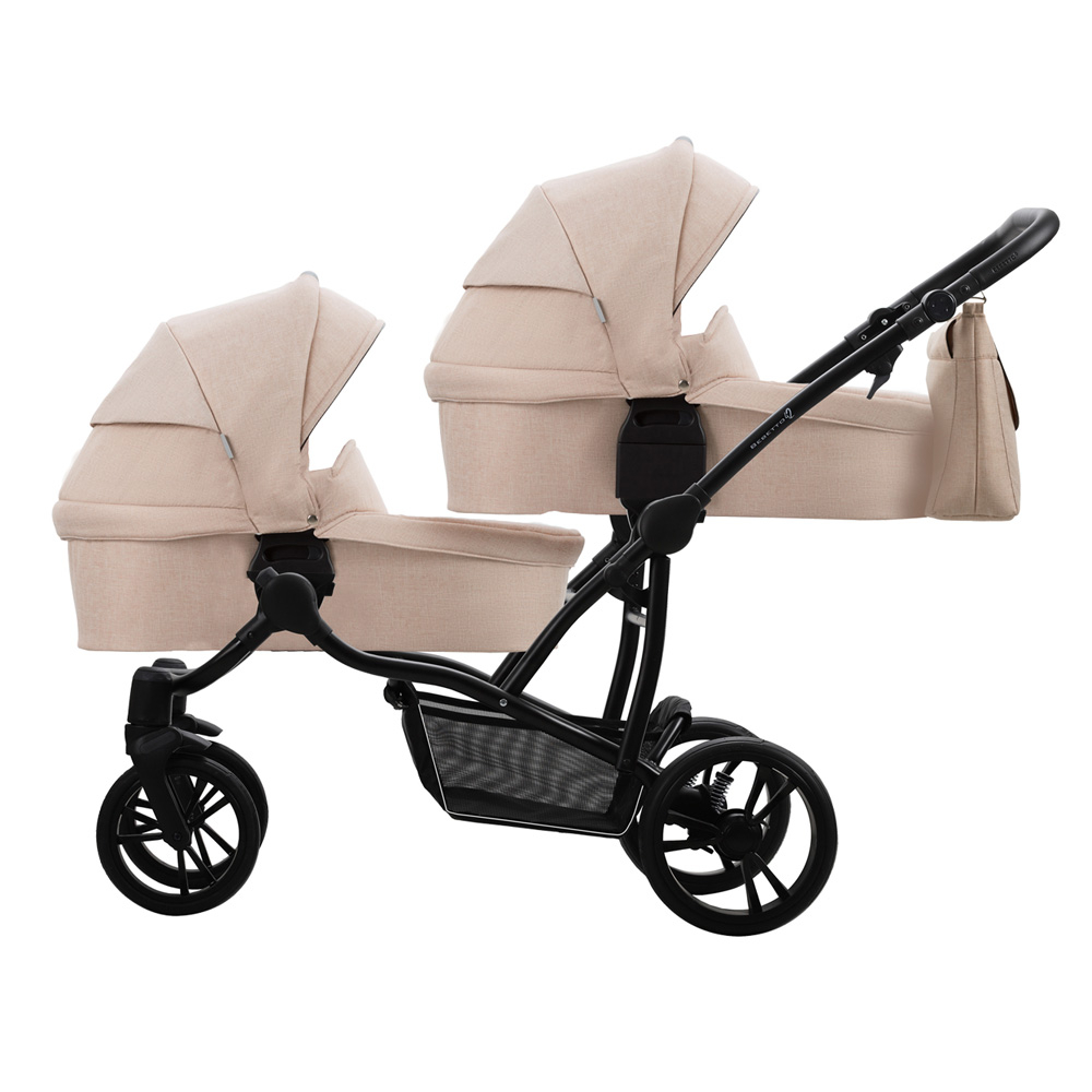 Оббивка модулів виконана з водовідштовхувальним тканини з високим захистом від сонячного ультрафіолетового випромінювання. Красиво підібрані кольори оббивки і обробка з еко-шкіри забезпечують сучасний зовнішній вигляд. Положення колисок в колясці спроектовано таким чином, що вони частково перекриваються, що робить цю двомісну модель більш компактною порівняно з іншими колясками для двійні. Коляску Bebetto B 42 Simply напевно оцінять люди, які віддають перевагу мобільність.