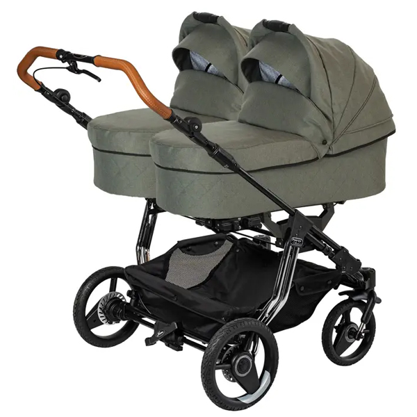 У комплект входить: шасі, 2 люльки, 2 прогулянкові сидіння, 2 накидки на люльки, 2 дощовики, кошик для покупок.