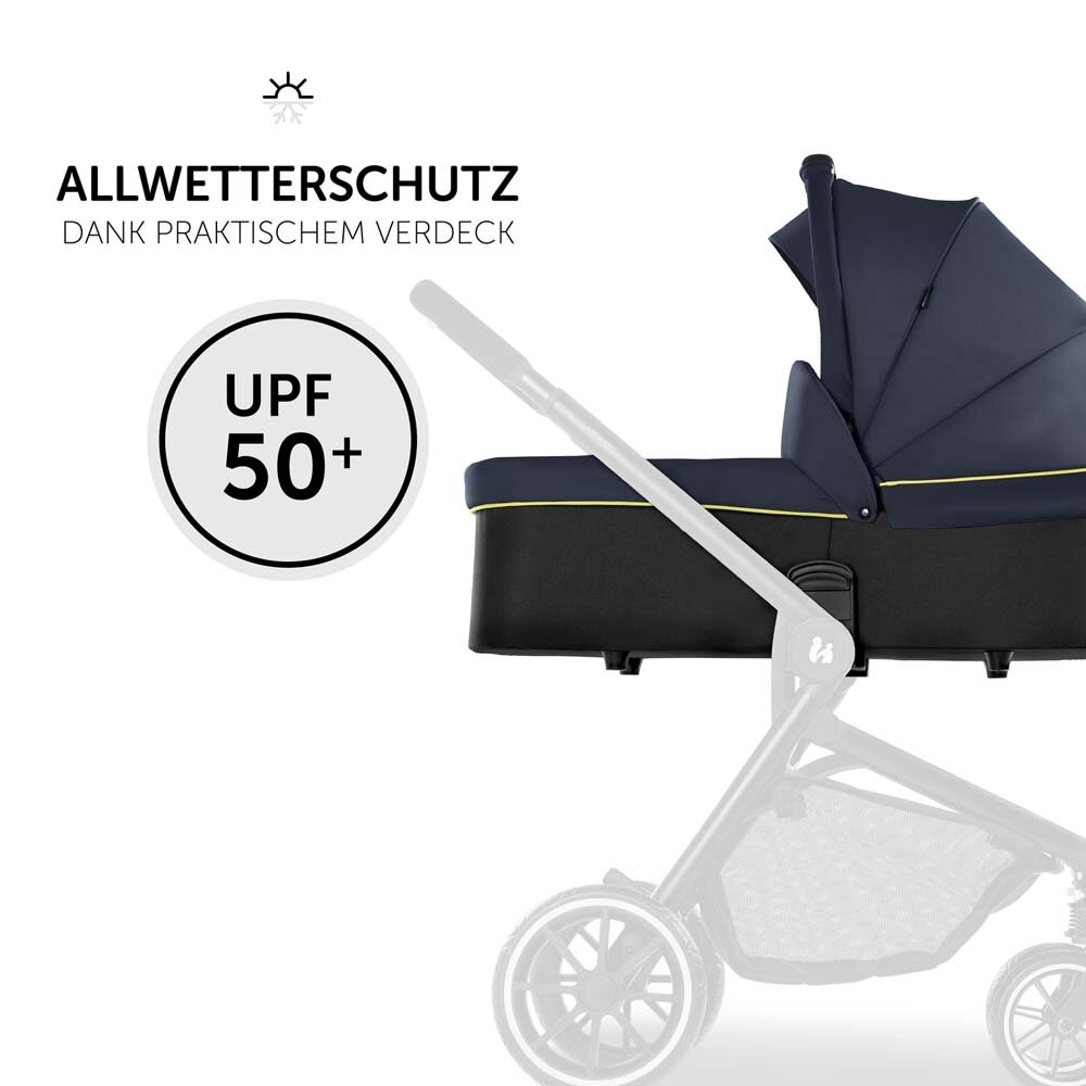 Простора люлька з м'яким матрацом і чохлом, який можна прати, забезпечує ергономічне положення лежачи. Максимальна вага дитини: до 9 кг. Високоякісні тканини міцні та довговічні. Крім того, люлька легко та інтуїтивно зрозуміло встановлюється на раму. Навіс, протисонцевий козирок, захист від сонця з рейтингом UPF 50+ і знімний чохол захистять вашу дитину від будь-якої погоди.