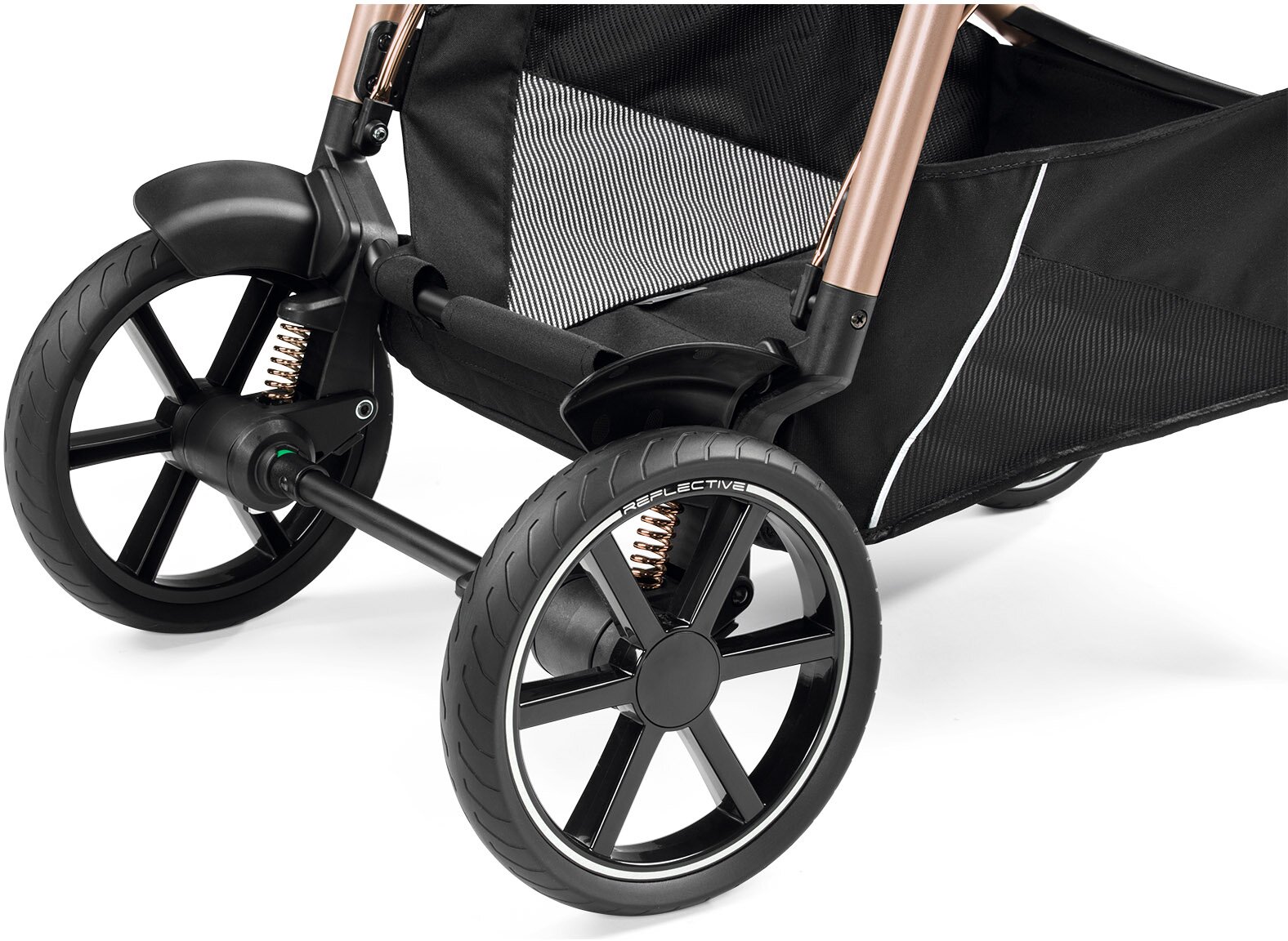 Шасі Veloce: Ширина лише 51 см. Новий централізований механізм складання розташований прямо на ручці. Ручка з еко-шкіри, регулюється під будь-який зріст батьків. Шасі складається разом з прогулянковим блоком, встановленим як в положенні «обличчям до мами», так і «обличчям до світу». Високоякісні прогумовані колеса з відкритою пружинною амортизацією дозволять з легкістю долати будь-які ділянки дороги. Зручне центральне гальмо. Колеса мають світловідбиваючий ефект. Функція фіксації передніх поворотних коліс. У складеному вигляді коляска неймовірно компактна і стоїть без опори.