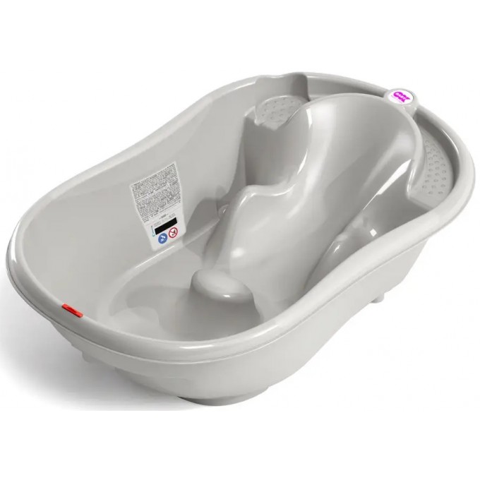 Пластикова дитяча ванночка з анатомічною гіркою для зручного розташування немовляти під час купання. Оснащена термодатчиком для контролю температури води. Має відділ для губки та мила, зливний отвір. Габарити ванночки - 26 x 53 x 93 см. Рекомендована дітям від народження до 12 місяців.