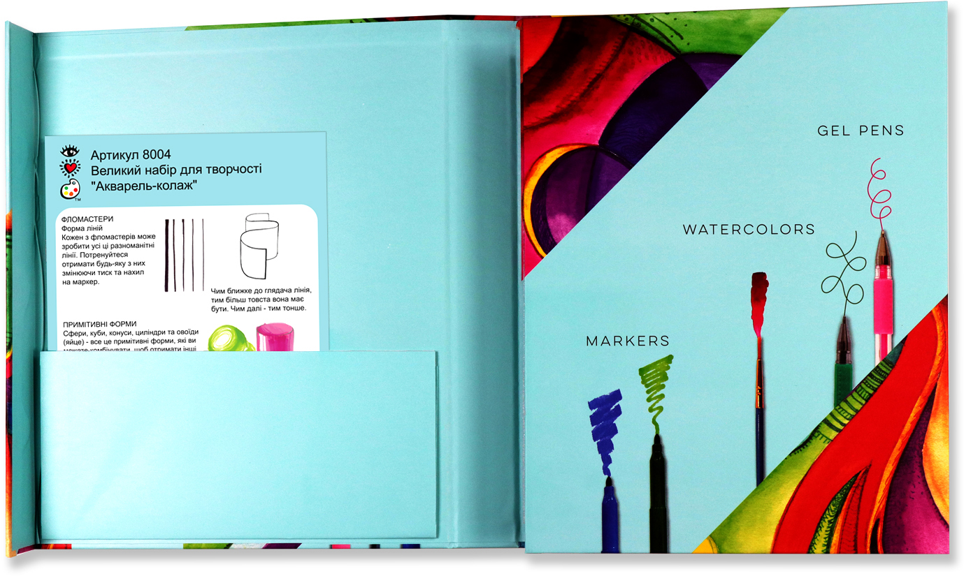 Набір у твердій обкладинці містить: Гід по техніках малювання українською мовою, 12 акварельних фарб яскравих кольорів, 6 яскравих гелевих ручок, 6 яскравих маркерів, Пензлик, 20 аркушів спеціального паперу 20.3х26.7 см.