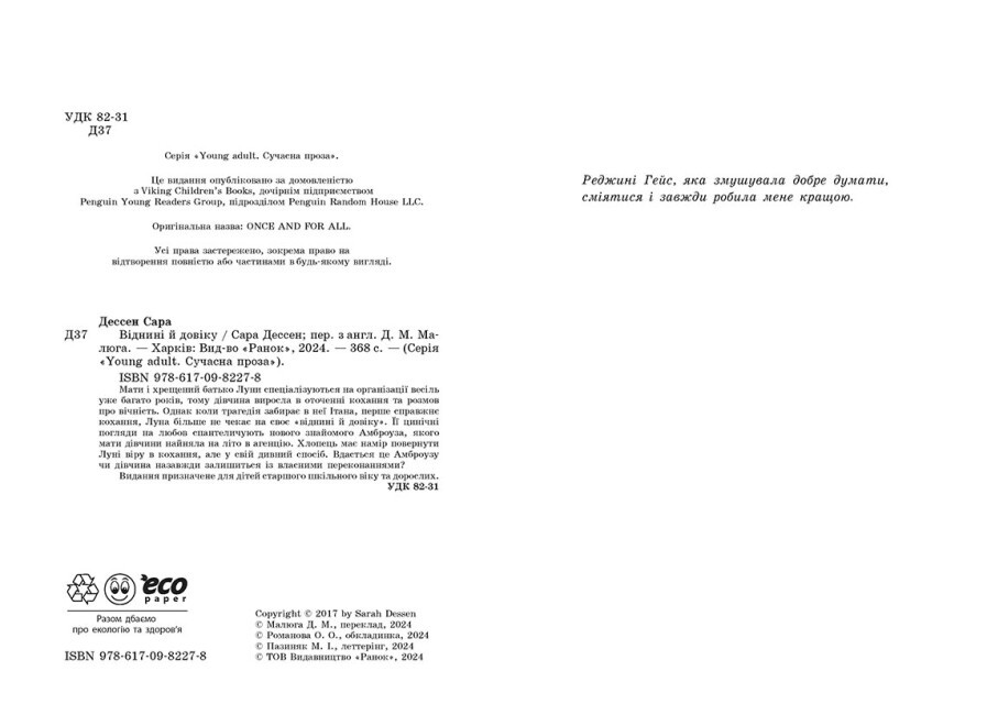 Мати і хрещений батько Луни спеціалізуються на організації весіль уже багато років, тому дівчина виросла в оточенні кохання та розмов про вічність. Однак коли трагедія забирає в неї Ітана, перше справжнє кохання, Луна більше не чекає на своє «віднині й довіку». Її цинічні погляди на любов спантеличують нового знайомого Амброуза, якого мати дівчини найняла на літо в агенцію. Хлопець має намір повернути Луні віру в кохання, але у свій дивний спосіб. Вдасться це Амброузу чи дівчина назавжди залишиться із власними переконаннями? Книжки для підлітків, які торкаються вразливих тем. Авторка, яка спеціалізується на літературі YA. Має близько 20 топових романів, відомих у всьому світі. Незабаром екранізація Нетфлікс.