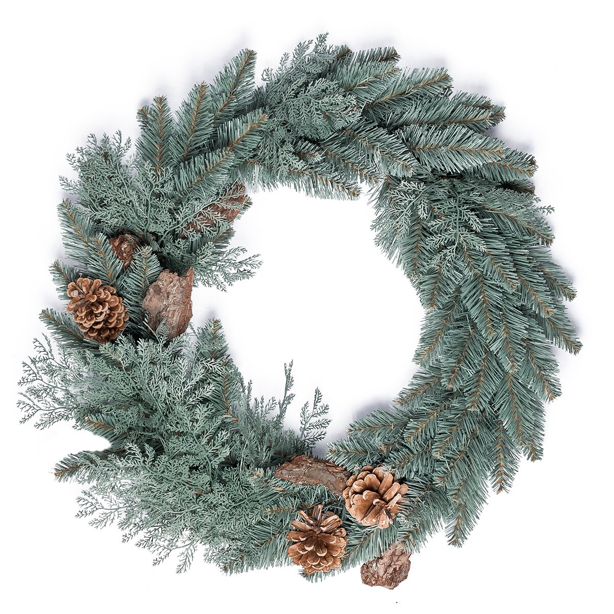 Оригінальний вінок з красивими гілками, прикрашений шишками стане прекрасним декором для вхідних дверей будинку, офісу в період новорічних свят.