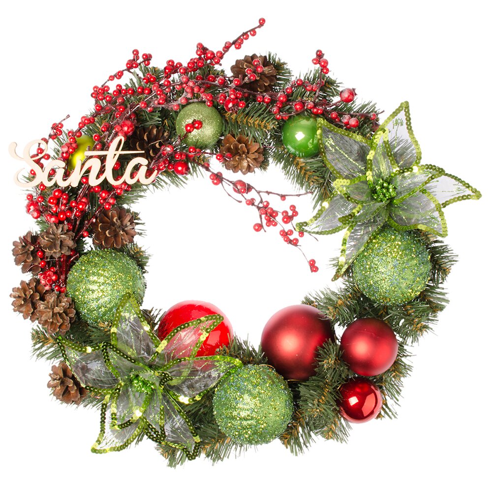 Блискучий вінок, прикрашений яскравим декором у традиційних різдвяних кольорах стане чудовою прикрасою для будинку і офісу, а також відмінним варіантом подарунка до новорічних свят. Висока якість матеріалу сприяє довговічності виробу.