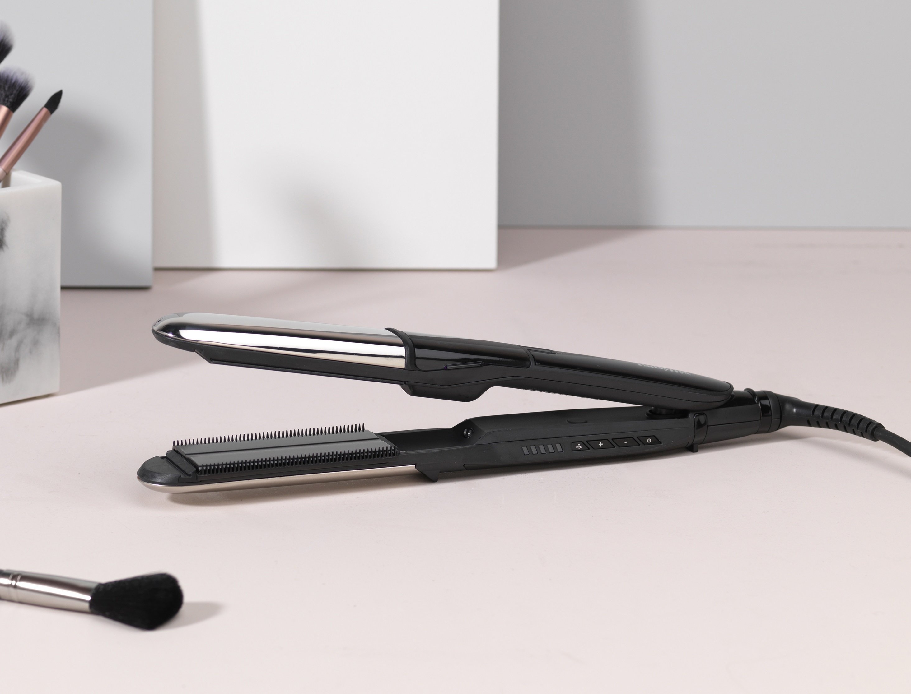 Babyliss, ST496E, Випрямляч для волосся з функцією пари, 67 Вт, чорний. Сьогодні випрямляч для волосся один з найбільш затребуваних інструментів для створення укладок і зачісок. Радимо звернути увагу на модель Salon Straight від бренду BaByliss. Її відмінністю є надгладке, міцне та довговічне покриття. Цей прилад має 5 рівнів температури та може нагріватися до 235°C за досить короткий часовий проміжок. З його допомогою можна легко вирішити вічну проблему дівчат: кучеряве волосся — випрямити, а пряме — накрутити.